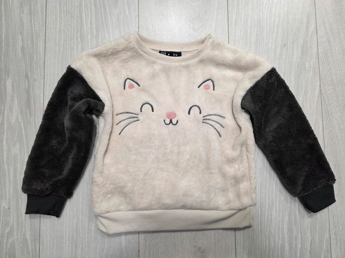 Pull fille sweat chat doudou tout doux gris et blanc cassé crème rose noir tout doux doudou taille 4 ans tex carrefour