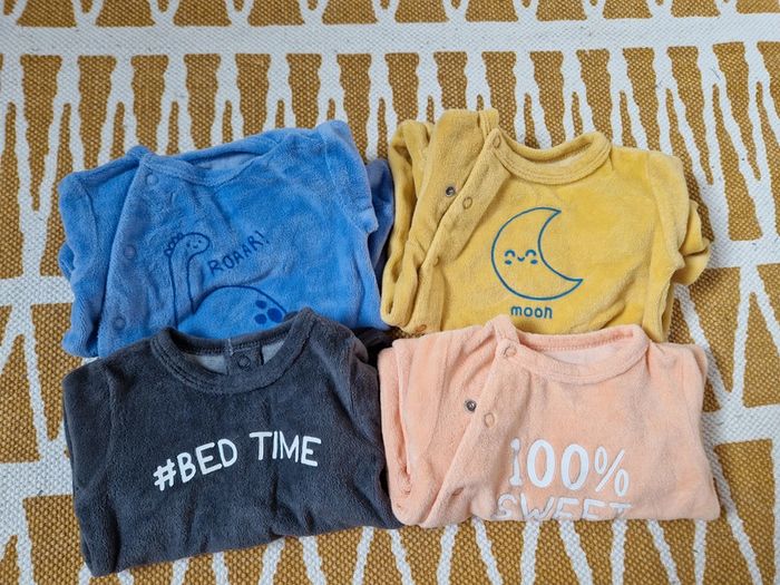 Vends 4 pyjamas tex. Taille naissance. Taille grand. Couleur saumon, bleu, jaune et gris foncé. Très bon état. Le gris n'a jamais été mis. #LullolyNaissance