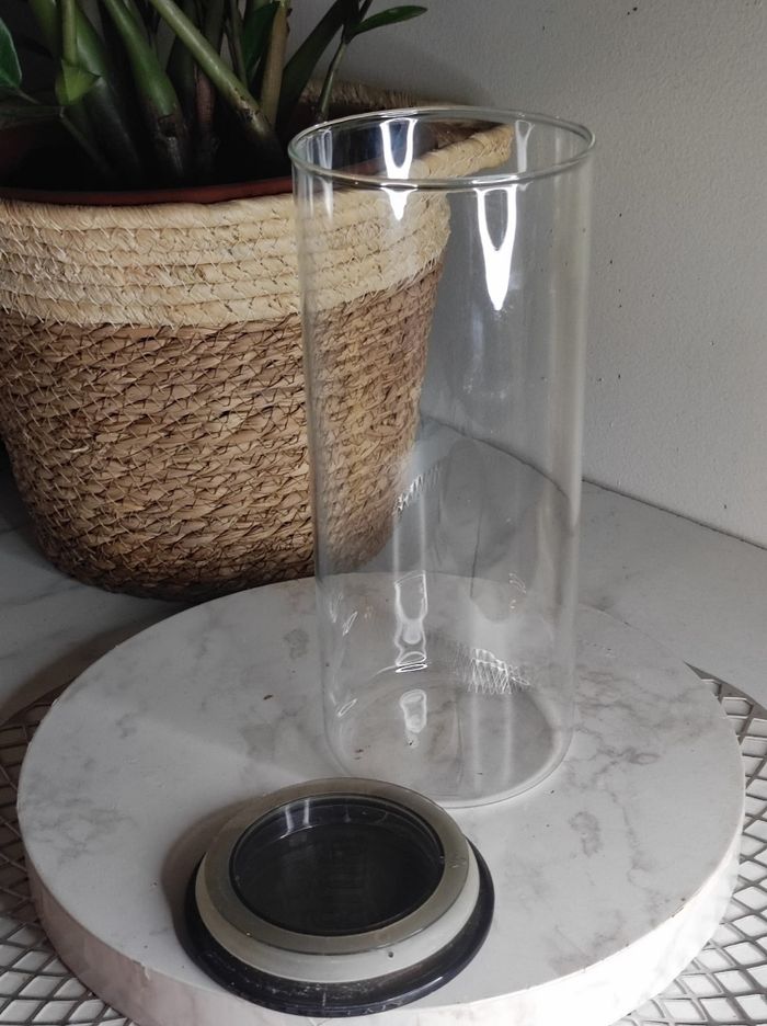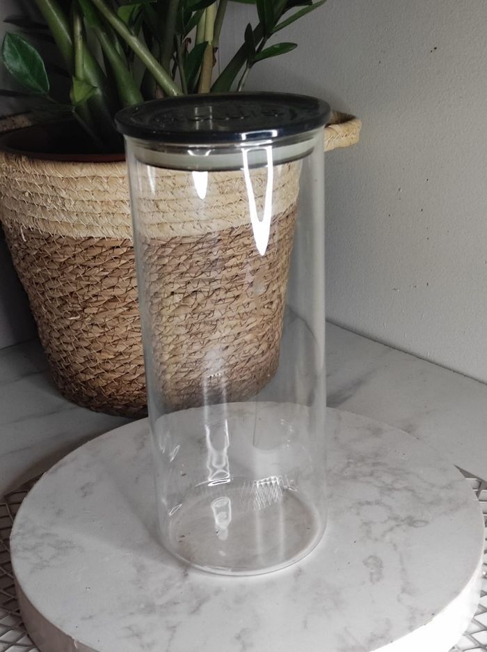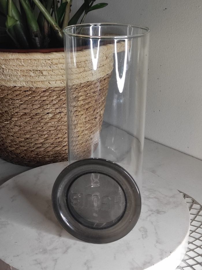Grand bocal / boite de conservation en verre avec couvercle de la marque simax. En parfait état ni fêle ou ebruchures. Dimensions H 24 x D 10,5 cm