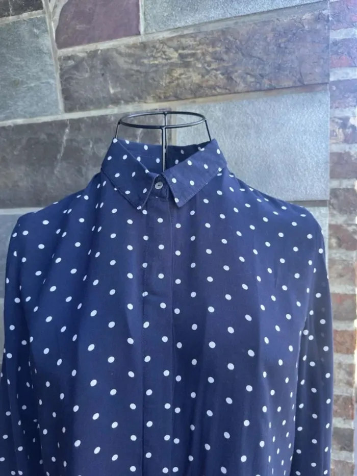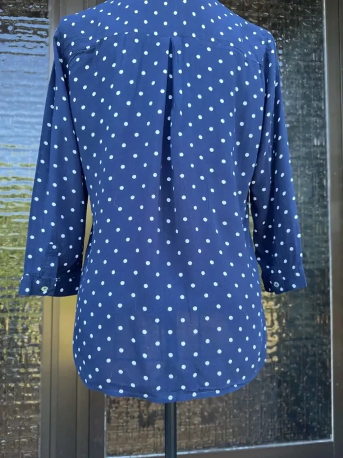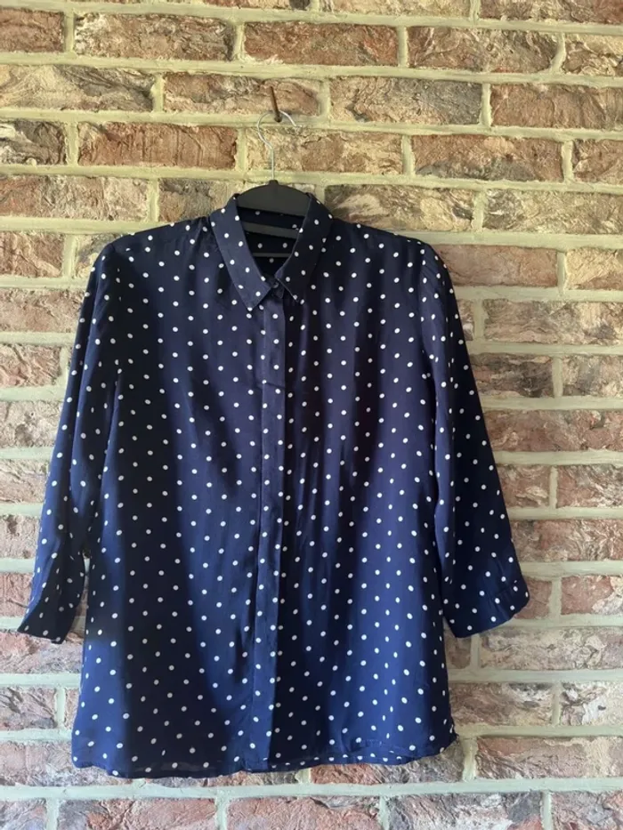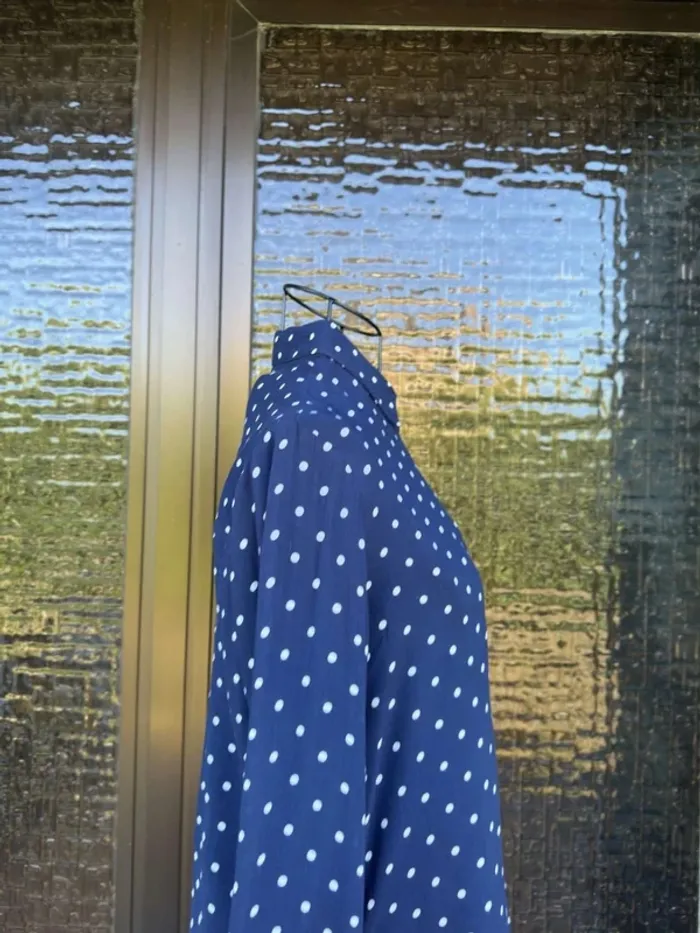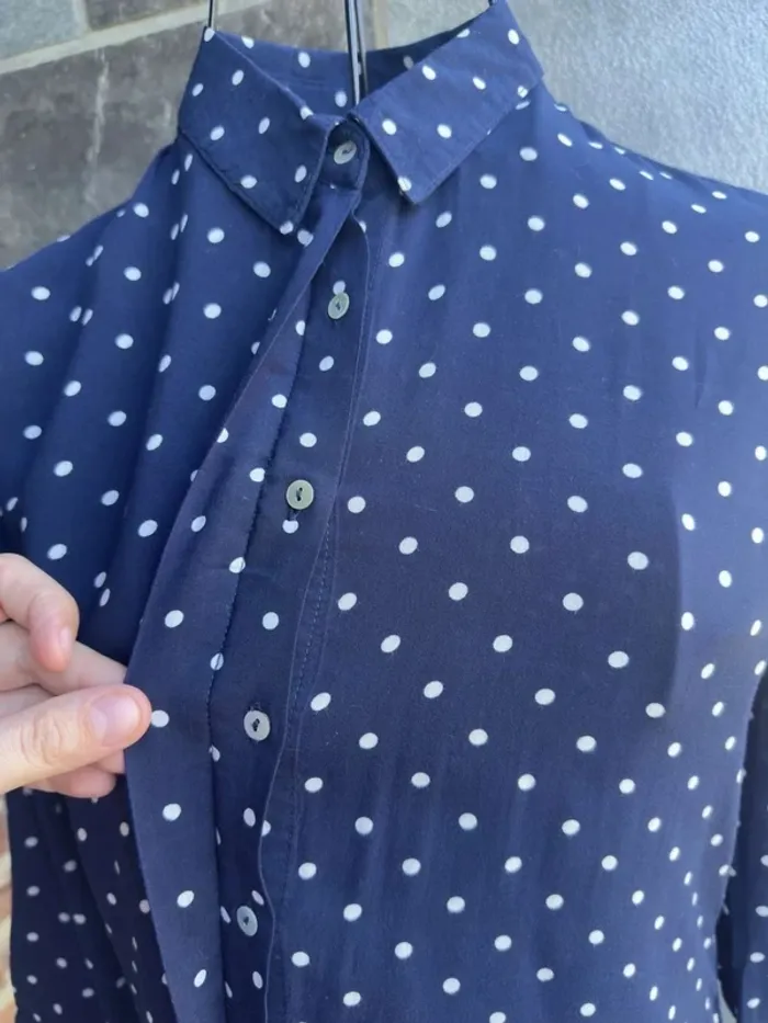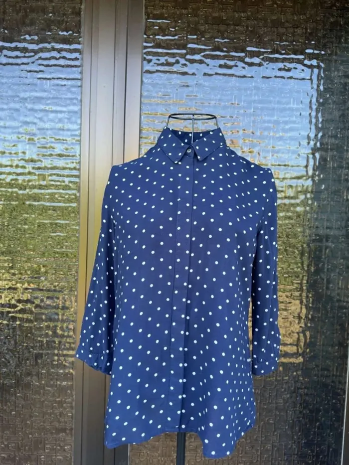 Chemise légère bleu marine à pois blancs – Manches 3/4 – Taille XS/S Élégante et intemporelle, cette chemise bleu marine à pois blancs est la pièce parfaite pour un look raffiné au quotidien. Son tissu léger et fluide assure un confort optimal, tandis que ses manches 3/4 apportent une touche féminine et moderne. ✦ Caractéristiques : • Coupe : droite et fluide, facile à porter et à associer • Manches : 3/4 légèrement évasées • Matière : légère, agréable sur la peau Pourquoi on l’adore ? Polyvalente, elle se porte aussi bien au bureau avec un pantalon habillé, en sortie avec un jean slim, ou en soirée avec une jupe taille haute. Un basique chic à pois qui traverse les saisons sans prendre une ride 🌸 - Taille : L'étiquette de taille n'est plus présente , mais je dirais qu'elle convient à un XS / S ( voir mesures ) - Mesures: Longeur --> 60 cm ( 64 cm à l'arrière ) Epaule à épaule --> 38 cm Aisselle à aisselle --> 49 cm #ChemisePois #XS #S #ModeFéminine #LookChic #ChemiseLégère #PoisStyle #ChicIntemporel #VintedFinds