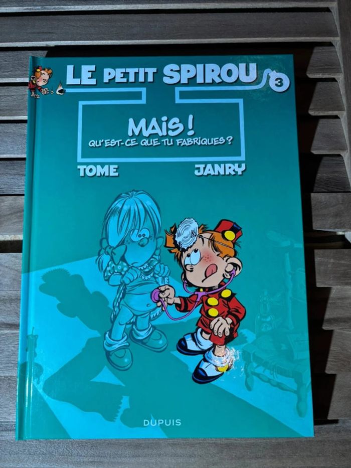 Bande dessinée Vol. 3 Mais ! Qu'est ce que tu fabriques ? Auteurs : Tome, Janry Editeur : Dupuis EAN/ISBN: 9782800119267 Résumé : Avant de grandir pour devenir l'aventurier que l'on connaît, Spirou a été petit. Et c'était pas triste. Toujours à l'affût d'une blague à faire au curé, l'abbé Langélusse, ou à son professeur de gymnastique, le navrant M. Mégot, le petit Spirou ne cesse ses espiègleries que pour s'intéresser aux douches des filles, à sa copine Suzette ou à sa prof de maths, la captivante Claudia Chiffre...