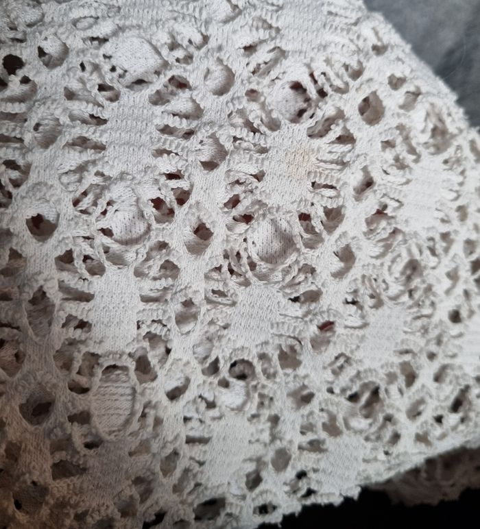 Haut blanc ajouré style crochet taille 38-40 ,longueur 74cm, largeur 54cm, longueur épaule à aisselle 25cm,largeur aisselle à aisselle 53cm, légère tache voir dernière photo et légèrement taché au col.