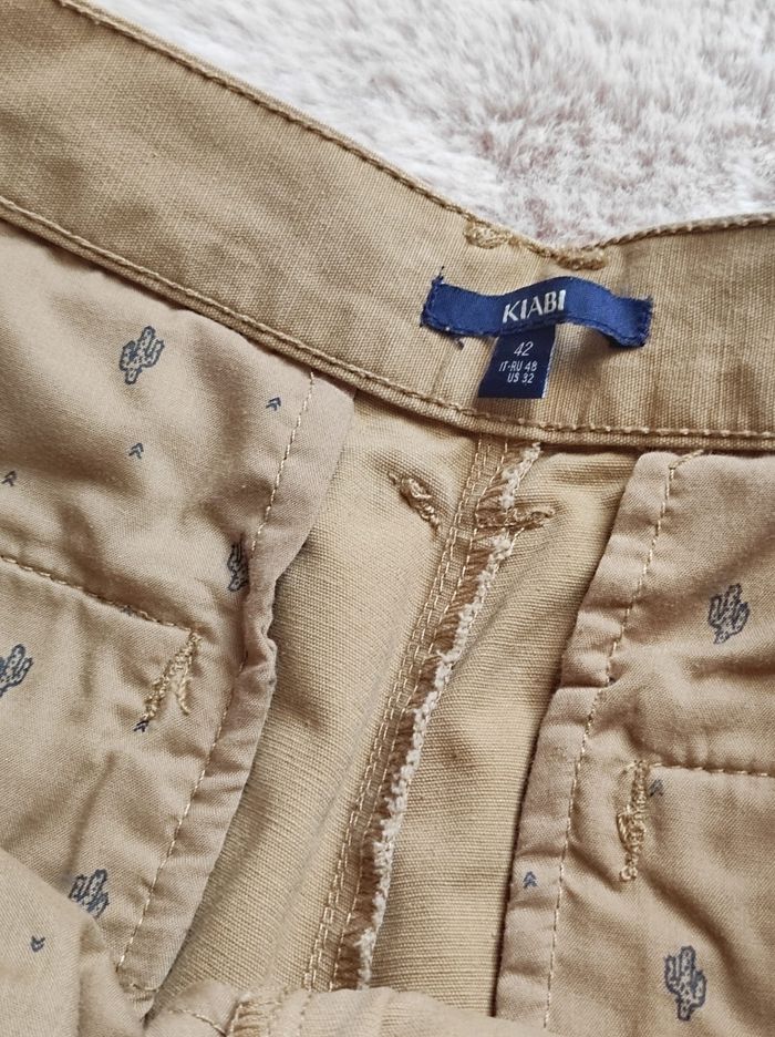 short cargo / bermuda de couleur beige/camel a plusieurs poches, fermeture éclair et bouton. Marque Kiabi en taille 42