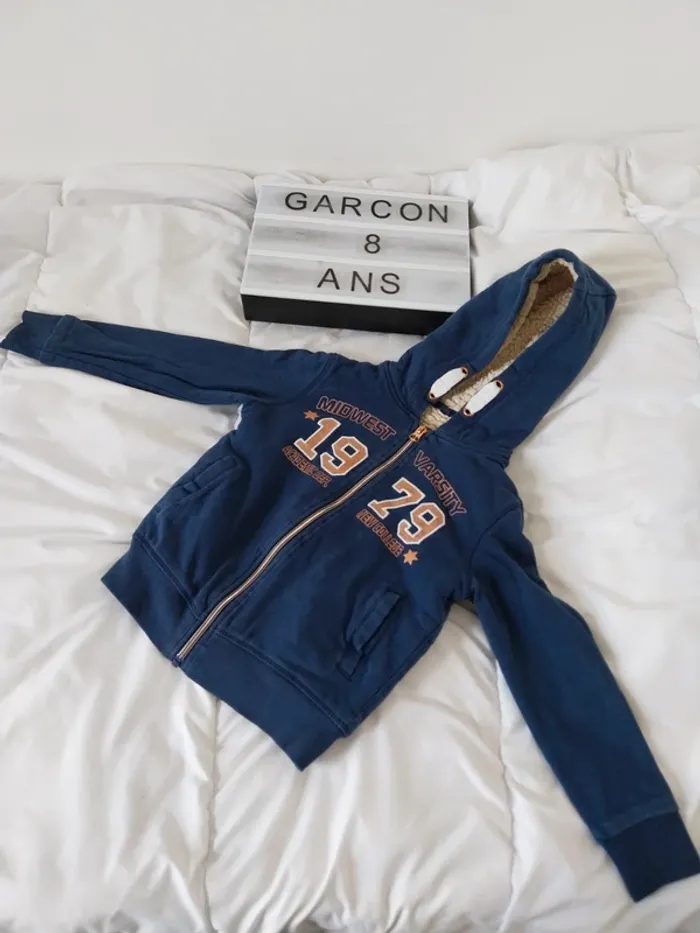 Gilet zippée moltonné avec capuche et poches garcon 8 ans. En très bon état. PAS DENVOI VINTED GO #giletzippegarcon8ans #giletgarcon8ans #giletaveccapuche #garcon8ans #8ans #midwestvarsity #celine430garçon8ans