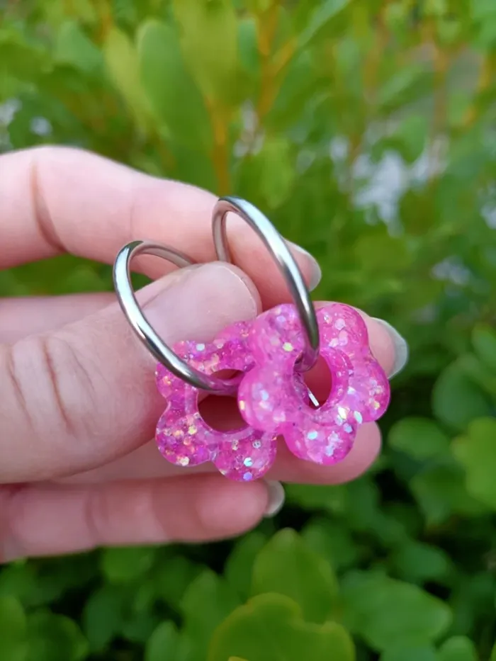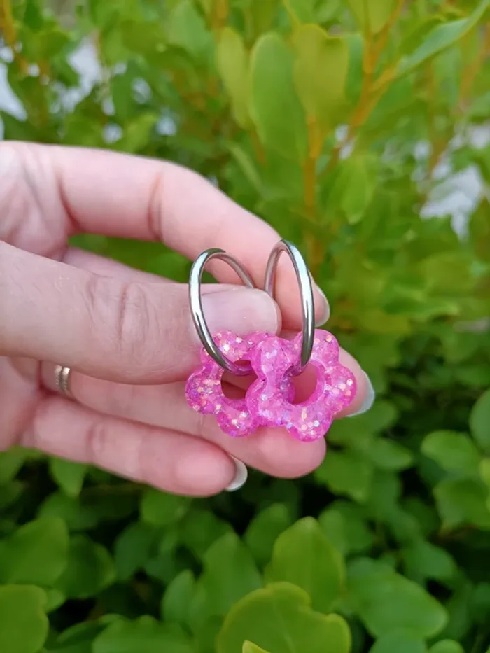 Boucles d'oreilles créoles argentées Acier inoxydable. Fleurs fushia pailletées en résine époxy. Possibilité de changer par des anneaux dorés (toujours en acier inoxydable). Boucles d'oreilles interchangeables ! Neuves, jamais portés. N'hésitez pas à me contacter pour d'autres coloris. #creolesacierinoxydable #creolesargentees #créolesdorees #creolesdoréesneuves #creolesfleurs #creolesfleursblanches #caroshannabijoux #bijouxneuf #bouclesdoreillesfantaisie #bouclesdoreillesneuves #bouclesdoreillesacierinoxydable