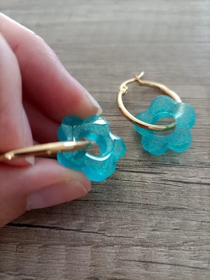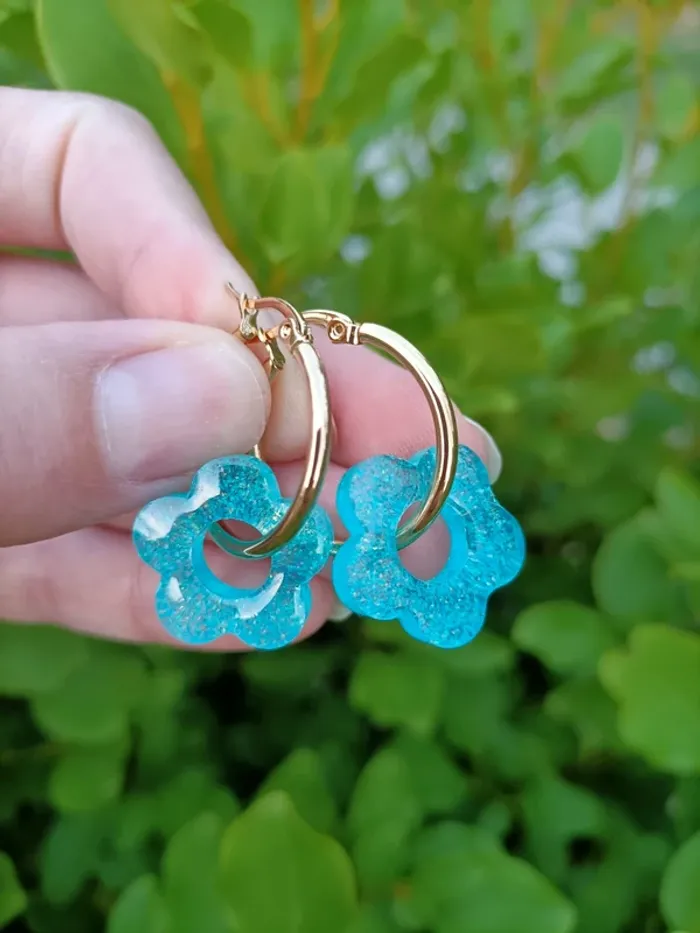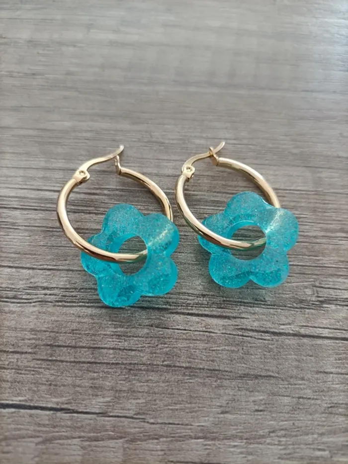 Boucles d'oreilles créoles dorées Acier inoxydable. Fleurs bleues pailletées en résine époxy. Possibilité de changer par des anneaux argentés (toujours en acier inoxydable). Boucles d'oreilles interchangeables ! Neuves, jamais portés. N'hésitez pas à me contacter pour d'autres coloris. #creolesacierinoxydable #creolesargentees #créolesdorees #creolesdoréesneuves #creolesfleurs #creolesfleursblanches #caroshannabijoux #bijouxneuf #bouclesdoreillesfantaisie #bouclesdoreillesneuves #bouclesdoreillesacierinoxydable