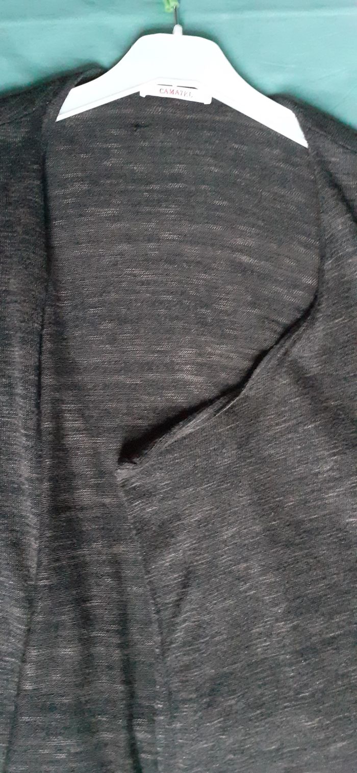 Vends un gilet fin 54 % viscose, 7 % fibre métallique, 39 % polyamide, sans bouton, couleur gris/marron strié, fibres brillantes discrètes, marque Camaïeu, taille L. Longueur de l'épaule à la base : 62 cm Largeur aisselle à aisselle : 47 cm.