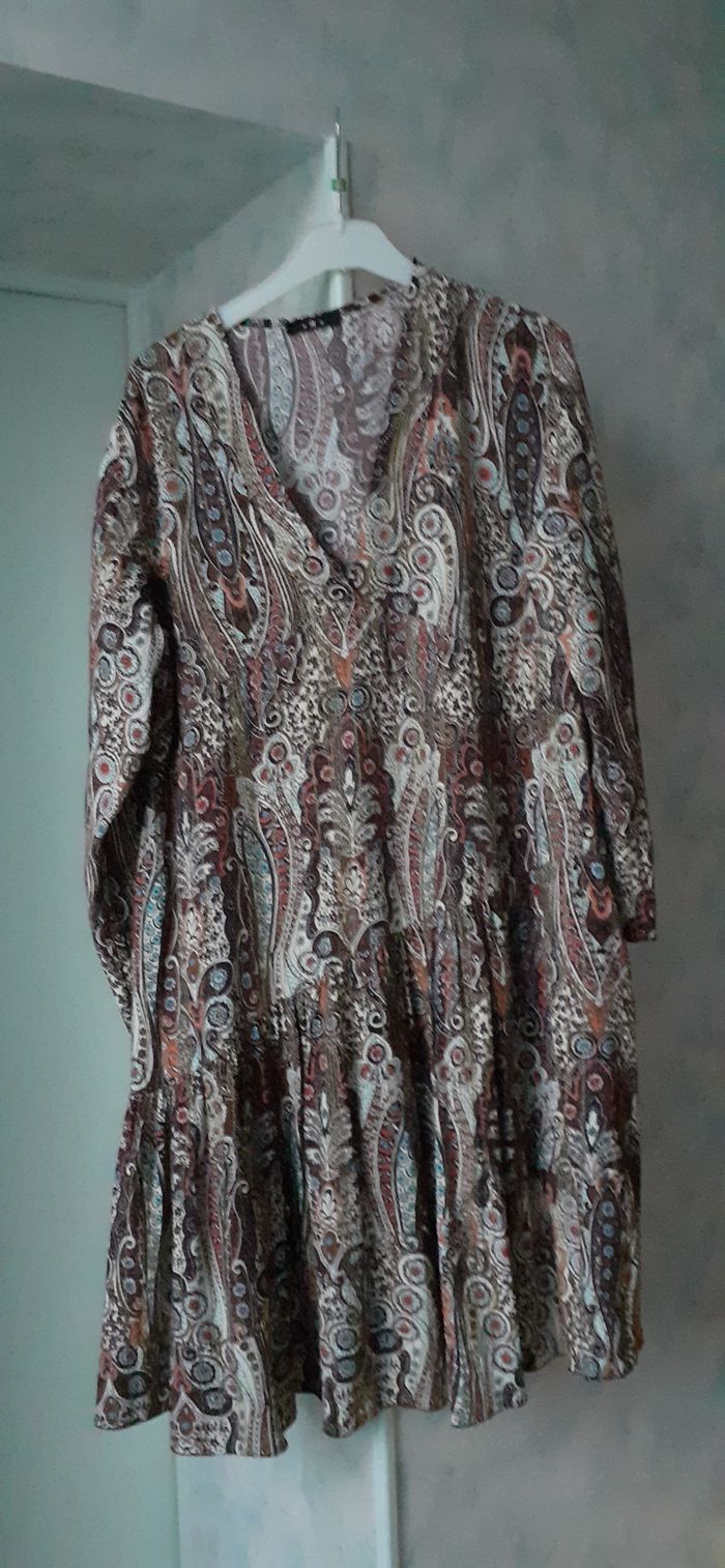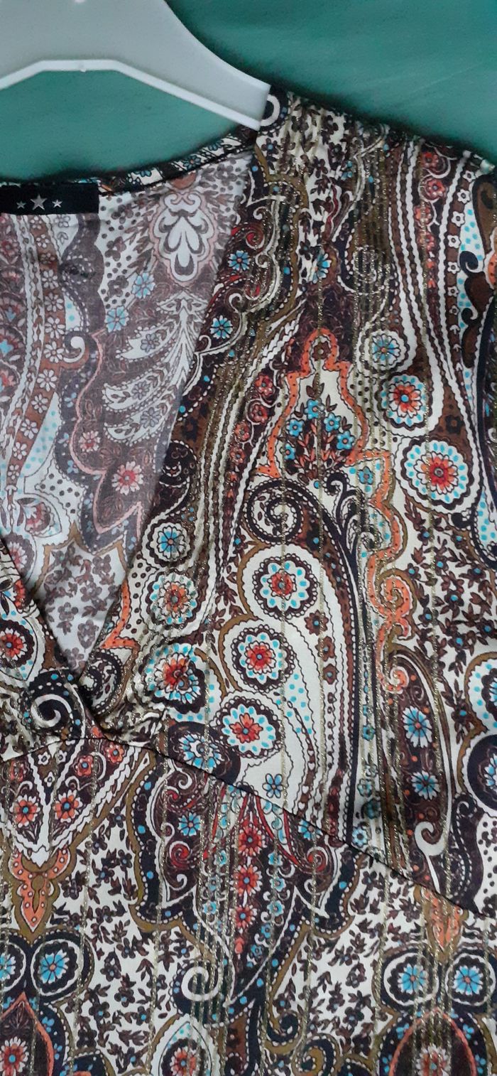 Vends une robe en tissu froissé, et à étages, manches longues, 100 % viscose, multicolore avec fils dorés, marque New Collection, taille 44. Longueur de l'épaule à la base : 100 cm Largeur aisselle à aisselle : 50 cm