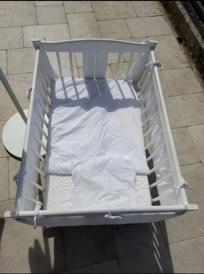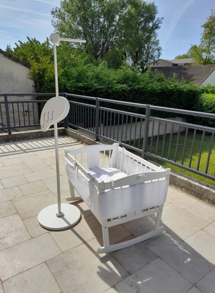 Vendu avec son tour de lit, le matelas, la couette et l'oreiller, il manque juste le voilage qui va sur le bec de la Cigogne Berceau blanc (l 71cm/ L 92cm/ H 68cm) Cigogne diamètre du pied 44cm et H 1,80m A certains endroits il y a de la peinture qui s'est écaillée