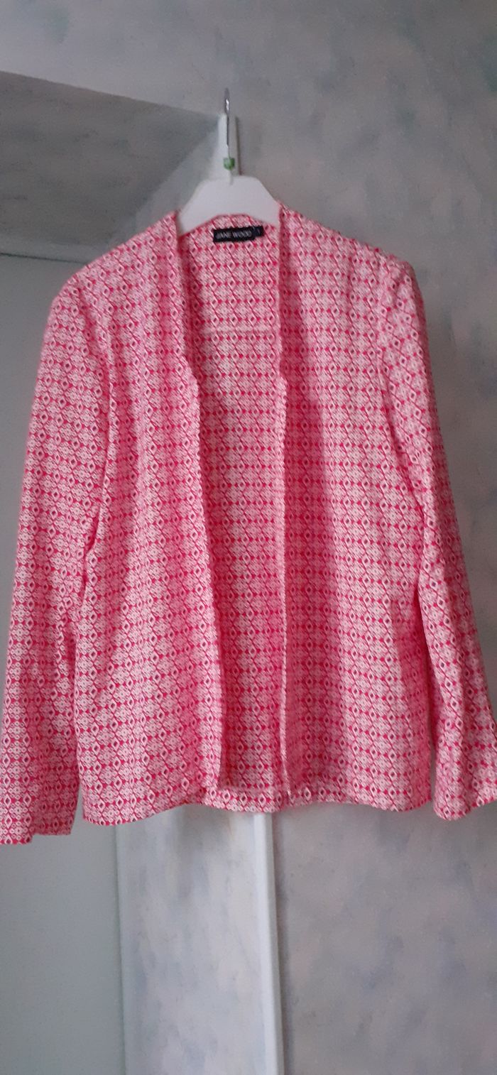 Vends une veste 100 % polyester, fluide, sans bouton, couleur rouge, blanc et bleu marine, marque Jane Wood, taille 1 36-38. Longueur de l'épaule à la base : 64 cm Largeur aisselle à aisselle : 50 cm.