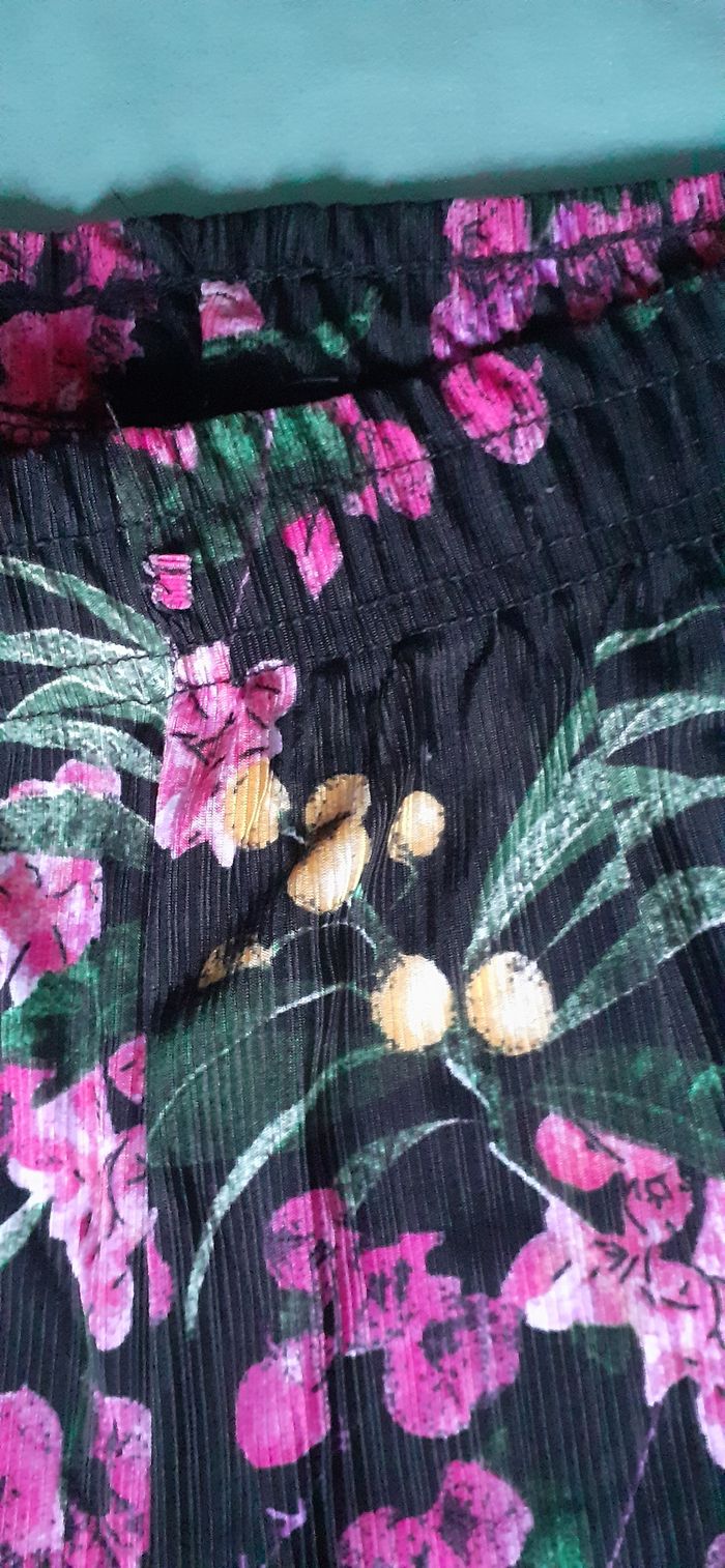 Vends un pantalon large 85 % polyamide, 15 % élasthanne, ceinture élastique, tissu plissé, jambes larges sans ourlet, fond noir avec fleurs roses, un peu transparent, taille S/M. Longueur entrejambe : 69 cm Largeur de la ceinture à plat : 32 cm Largeur des jambes : 31 cm.