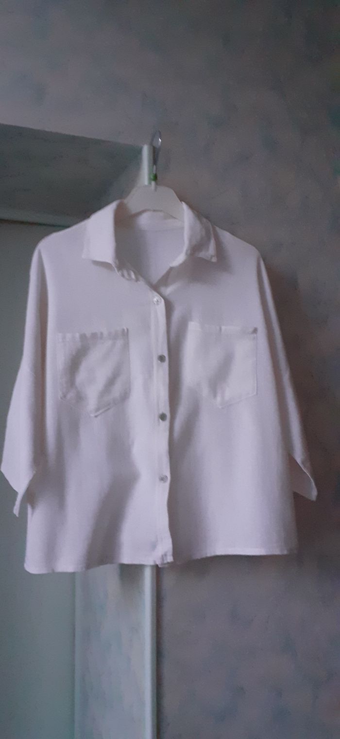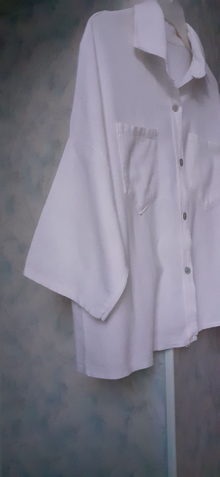 Vends une chemise 100 % coton fibres lâches, large et courte, un peu transparente, manches 3/4, deux poches sur le buste, couleur blanc, taille 48. Longueur de l'épaule à la base : 54 cm Largeur aisselle à aisselle : 58 cm.