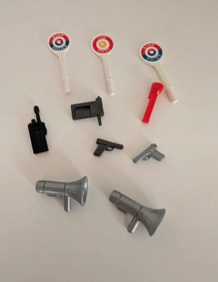 Playmobil lot vrac accessoires police panneau stop police pistolet lampe torche talkie walkie mégaphone vendu comme sur les photos