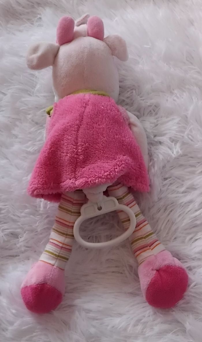 Doudou peluche musical vache en velours de couleur blanc Vêtu d une robe en velours de couleur rose Tiens entre ces mains un oiseau de couleur orange Jambes en tissus de couleur blanc rayés multicolores Foulard en velours de couleur vert autour de son cou Attache sur la tête pour l accroché ou vous ke souhaitez Anneau en plastique pour déclencher la musique