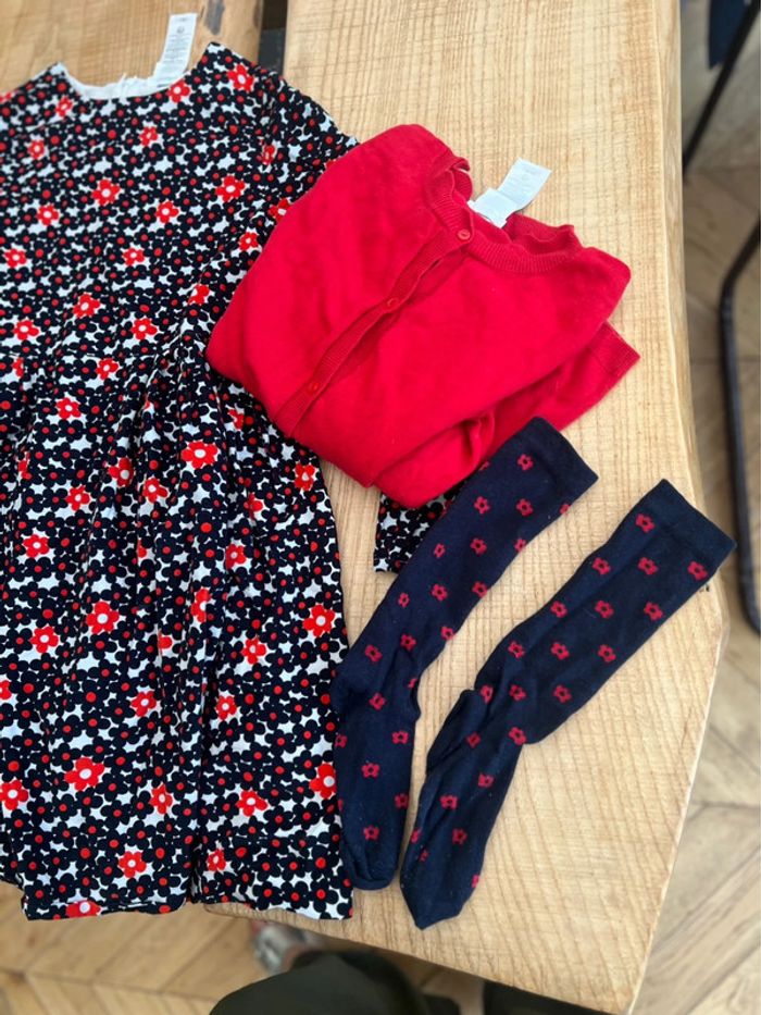 Ensemble d’hiver Jacadi Gilet et robe en velours lisse Chaussettes hautes+ barrette offerte Le tour du même thème à fleurs et festons Prix fixe