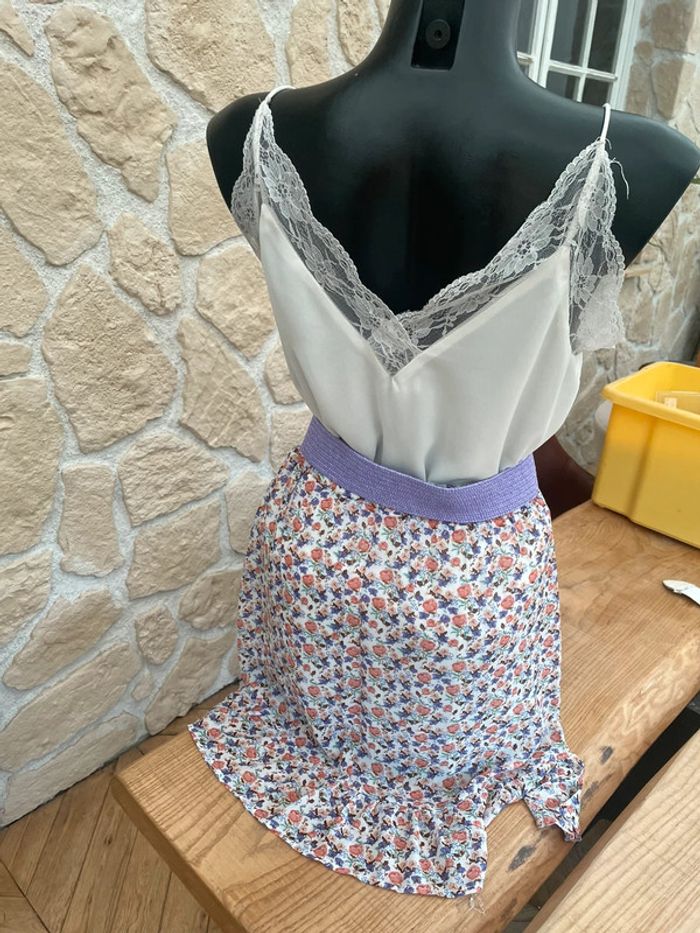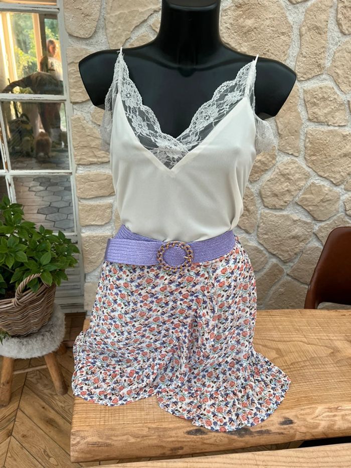 Jupe d’été taille S / 36 violet Lila corail En voilage doublé à fleurs Marque Suzy & Milly Ceinture neuve pour 5€ de plus Débardeur non disponible