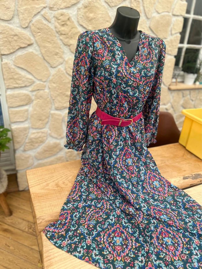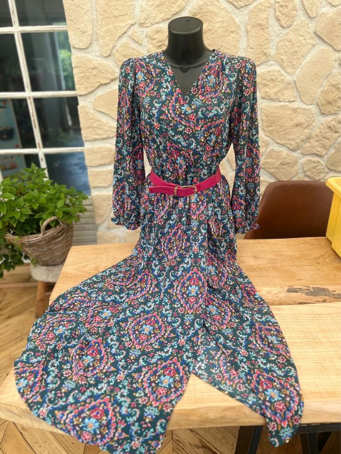 Robe longue Taille S / M 36 - 38 Grande fente sur le devant Décolleté cousu qui ne baille pas Fluide , vendue sans la ceinture Comme neuve , juste un trait dans le tissu à un endroit voir dernière photo