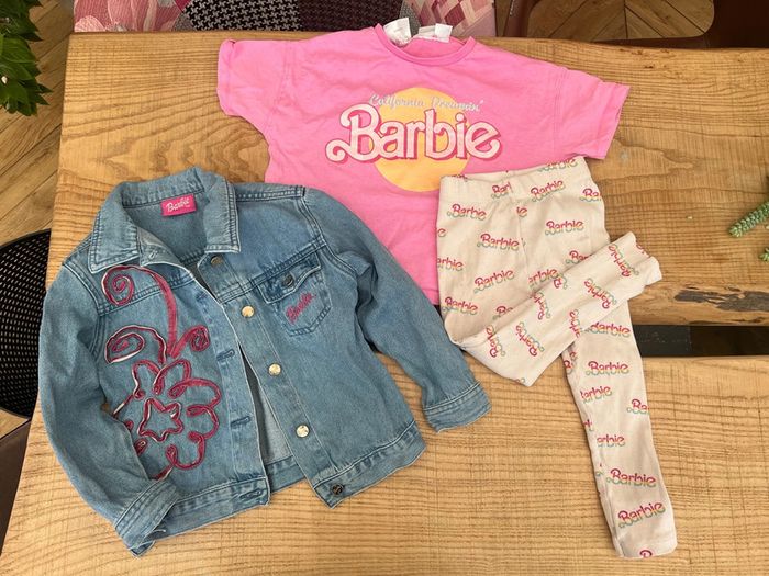 Tenue fille barbie T-shirt et legging Zara 4 ans porté une fois mais ma fille a fait des bulles 🫧 😓 donc quelques taches discrètes voir deux dernières photos 🥺 Veste barbie 5 ans coupe loose Super sympa porté