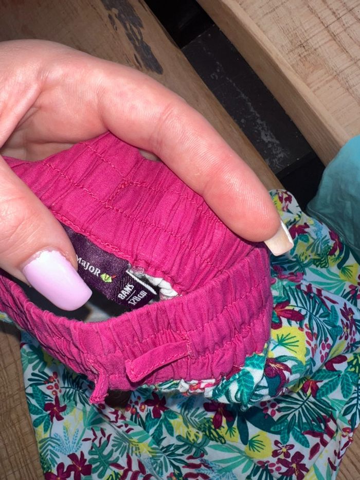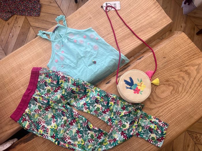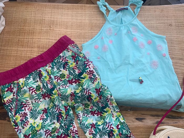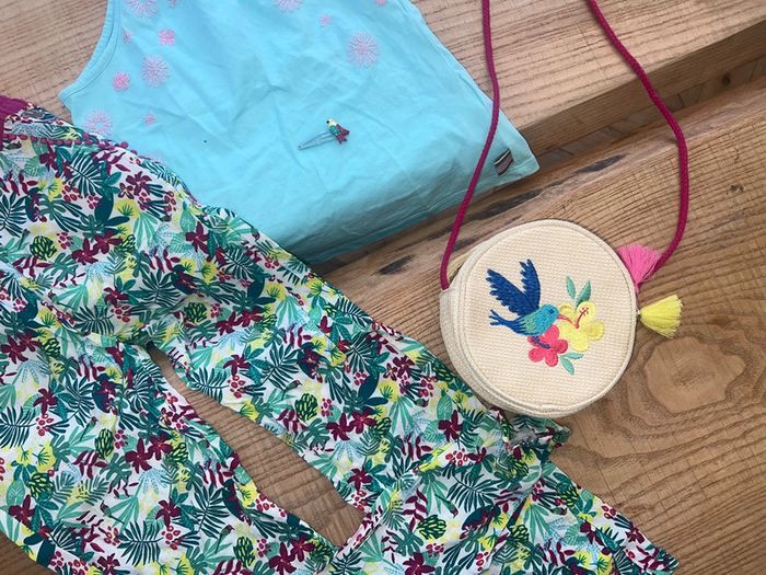 Ensemble sergent major d’été Thème oiseaux tropicaux Débardeur à bretelles 7 ans Tbe Pantalon sarouel fluide 8 ans Tbe Sac à main neuf étiqueté (15€99) Pince à cheveux Tbe