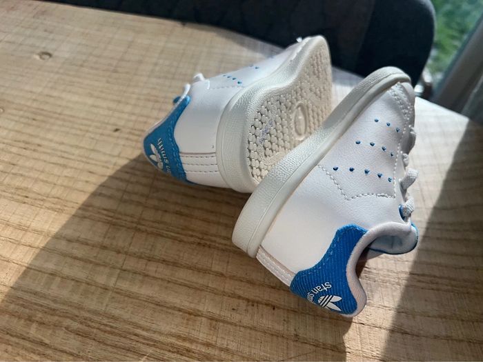 Chaussures Basket Stan Smith adidas bleu clair et blanche à lacets élastiques peu portées - photo numéro 3