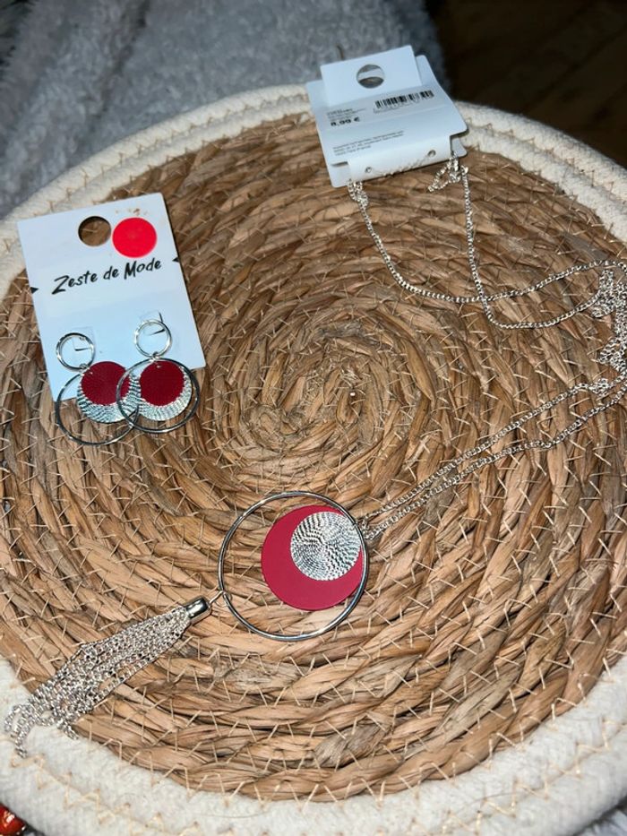 Parure de bijoux argenté rouge bordeaux collier longs boucles d’oreilles double anneaux pendantes Neuf idéal pour offrir , cadeau Zeste de mode