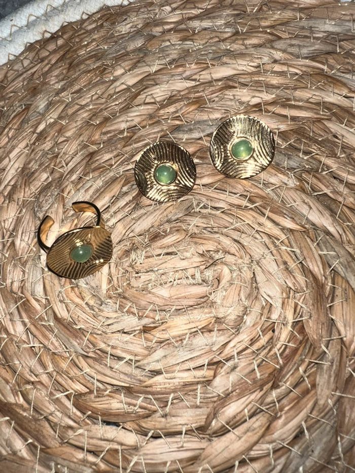 Ensemble parure bijoux doré vert kaki bague réglable bouche d’oreille - photo numéro 1