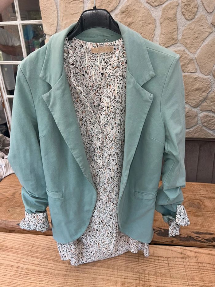 Ensemble blouse chemise veste blazer blanc vert d’eau femme taille M 38 via via - photo numéro 2