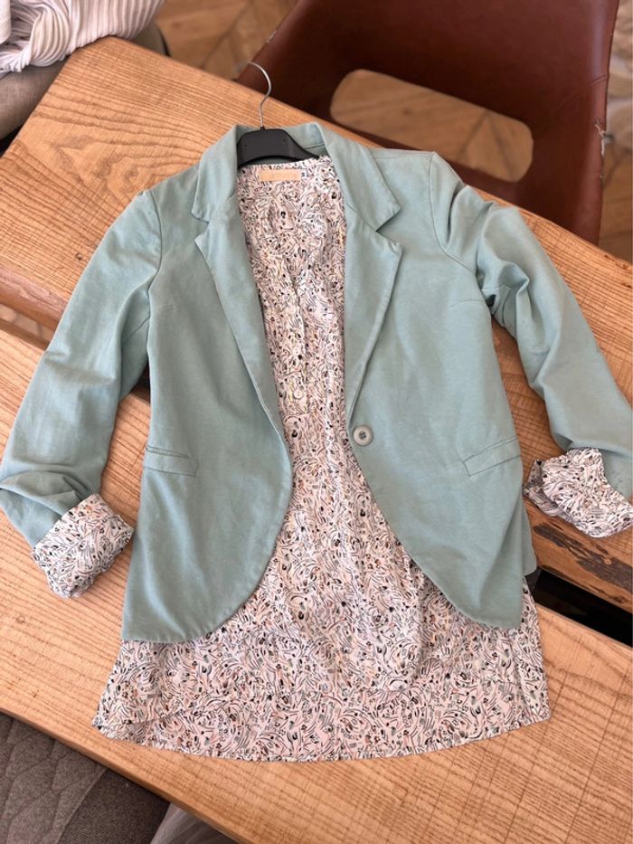 Ensemble blouse chemise en Tbe et veste blazer en be Couleurs blanc et vert d’eau Pour femme taille M 38 Marque via via Ensemble acheté 50€ en boutique indépendante