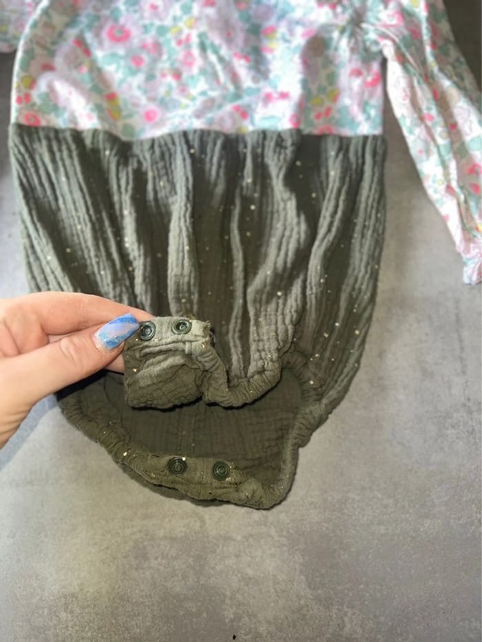 Ensemble en excellent état 18 mois en Liberty betsy tilleul et gaze de coton Barboteuse faites par une créatrice + une barrette Jacadi