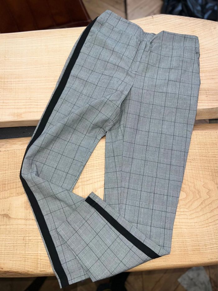 Marque Etam Taille L mais taille 38 En excellent état Un pantalon élégant à porter pour toutes les occasions ! Sympa avec des baskets Motif à carreaux et bandes noires - Pantalon cigarette - Matière fluide - Taille standard élastique - 2 poches - 1 poche factice à l'arrière - Couleur unie