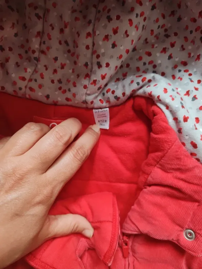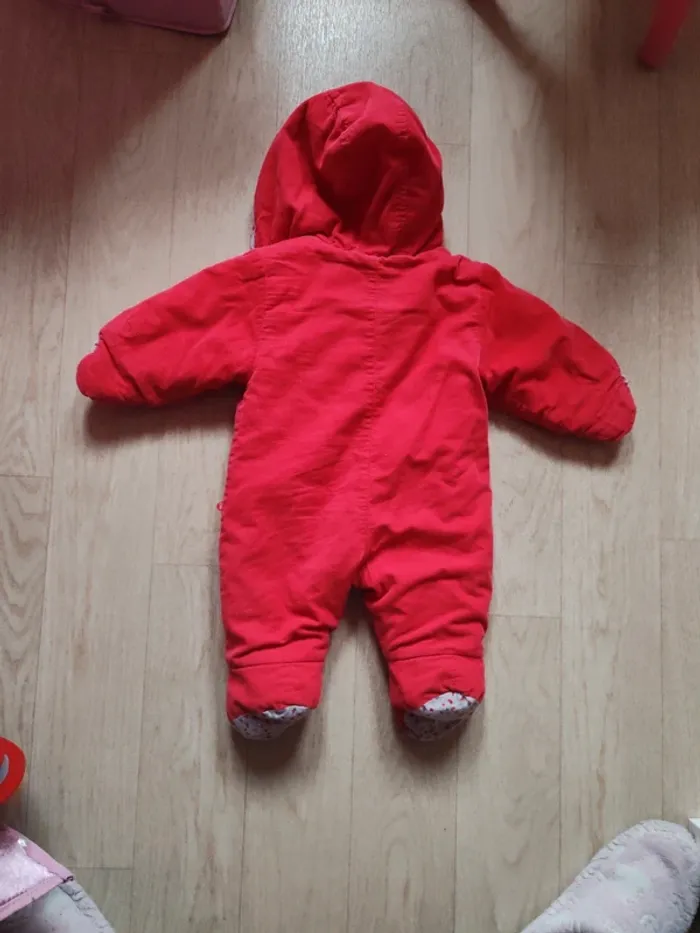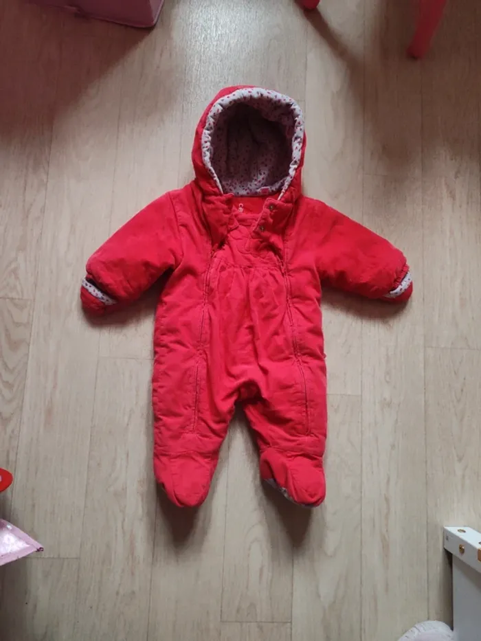 Vends une combinaison pour bébé fille Obaibi. Idéale en hiver pour la voiture ou la poussette. Taille 6/12 mois. Couleur rouge fushia. Moufles incorporées et amovibles en les rentrant. Fermeture zippée et capuche. Peu utilisée, en très bon état !!