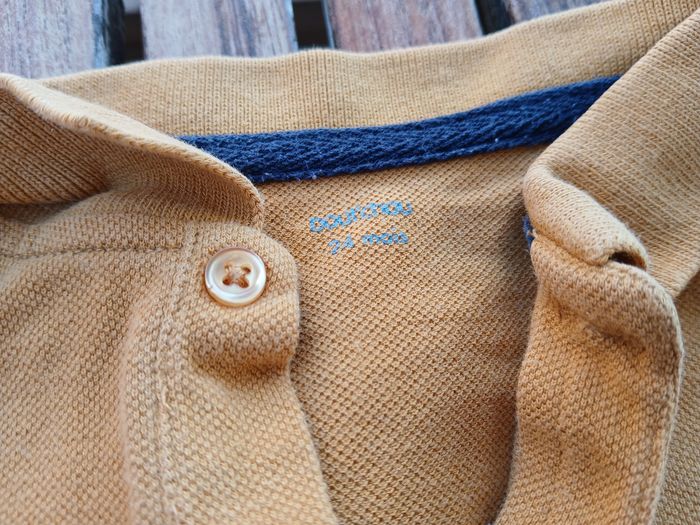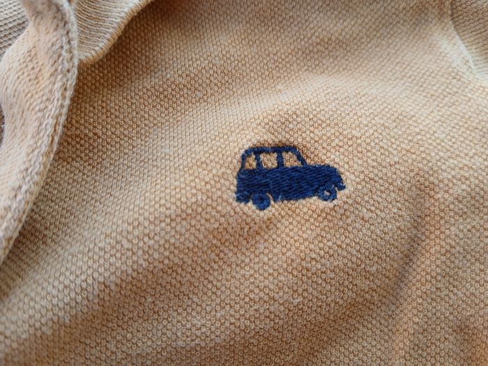 - Polo jaune moutarde à manches longues avec petite broderie d'une voiture a l'emplacement de la poche de poitrine. Marque Bout'Chou, taille 24 mois. Très bô état