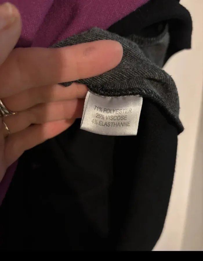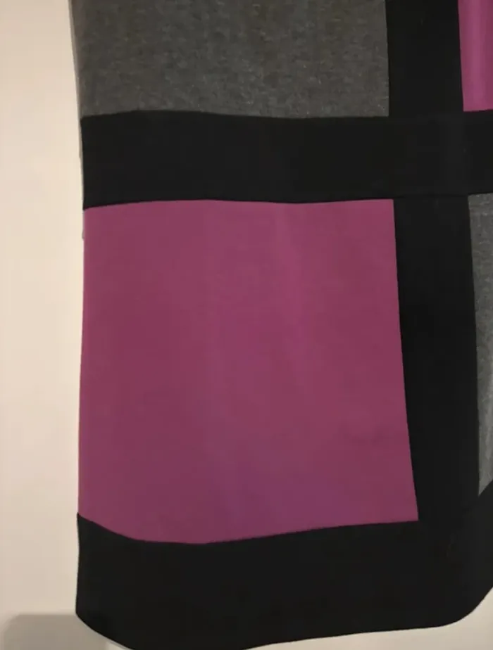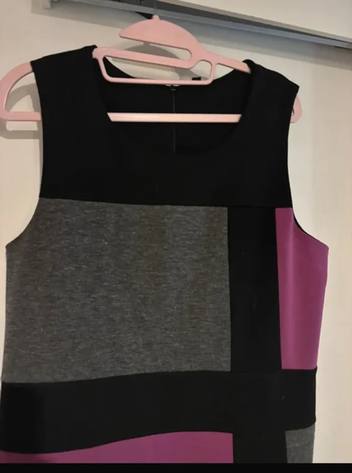 Robe élégante sans manches, avec un joli jeu de blocs graphiques dans les tons violet, gris et noir. Fermeture zippée dans le dos. Confortable grâce à sa composition stretch : 71 % polyester, 25 % viscose, 4 % élasthanne. Taille 44, coupe droite, effet structuré. En très bon état ✔️ #robe #robecourte #robetaille44 #robegraphique #robecolorblock #ceremonie #mariage #bapteme #soirée #modefemme #lookchic #stylefemme #fashionaddict #grandeTaille #stretch #polyester #viscose #élasthanne #vinted #vintedfrance #vintedfemme #kawaba #vintedmode #vintedstyle #lookdujour #outfitinspo #ootd #classy #graphique#femme44#robe44