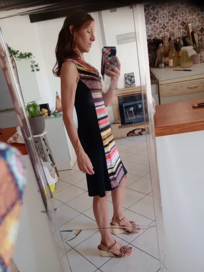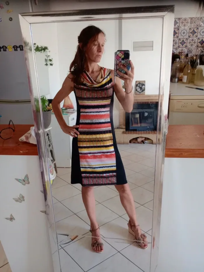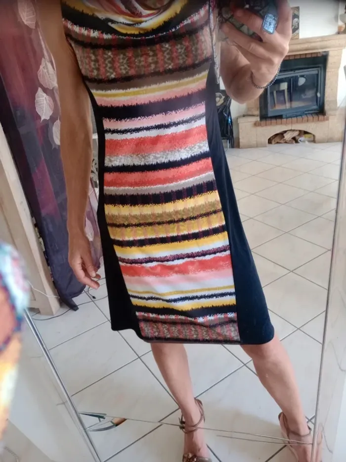 Superbe robe avec un motif coloré très original sur l'avant (rouge, jaune, noir, blanc). Elle a un effet de superposition qui allonge la silhouette. La robe est noire sur les côtés, le dos et les manches. Le col bénitier ajoute une touche d'élégance. Elle est en très bon état.