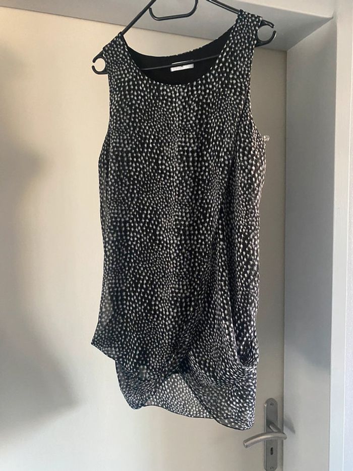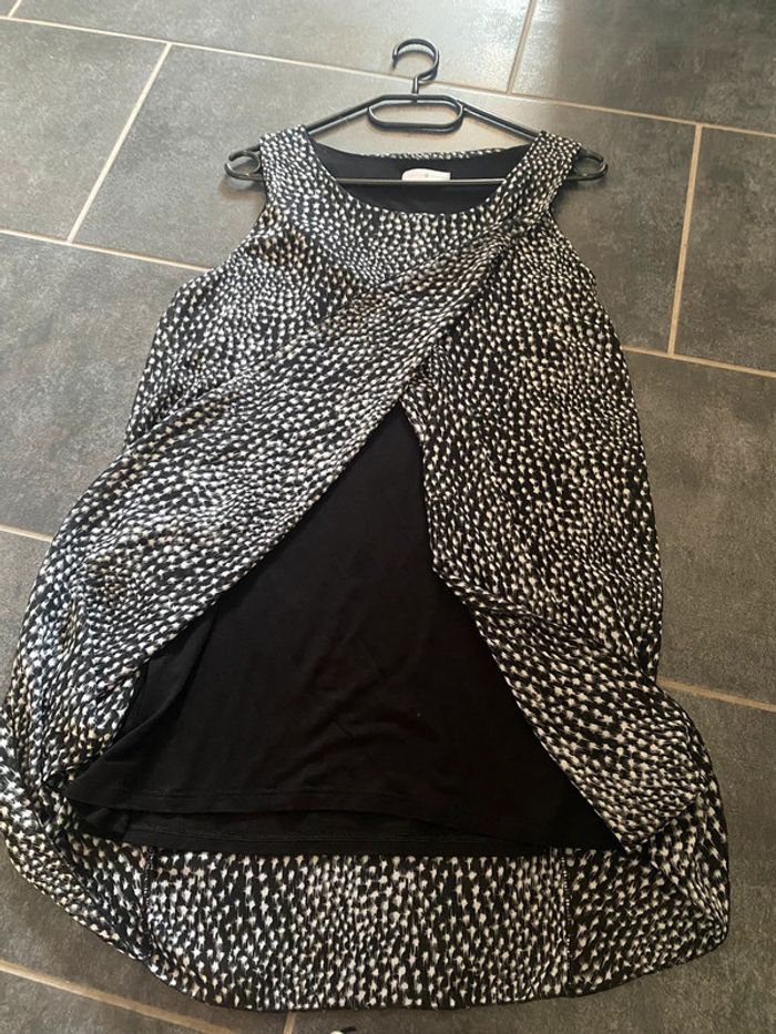 Robe / tunique cache-cache, Taille 40 Très agréable à porter avec un legging en dessous Longueur environ 71 cm de l’épaule au bas de la robe pour la partie noire en dessous Les pans (noirs/blancs) sont un peu plus longs (environ 81 cm) #laeti67470 #laeti67470_robe #laeti67470_40 #laeti67470_robe_40