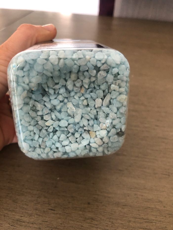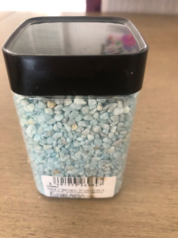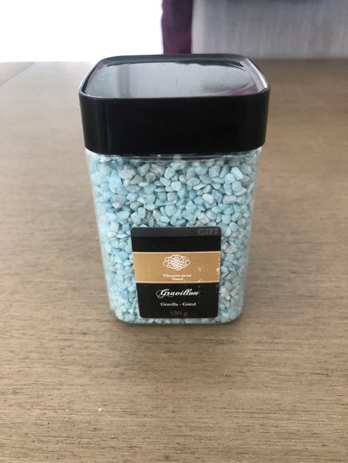 Boîte de gravillons bleus pour décorer les tables neuf. Peut servir pour un mariage ou un baptême. #decorationleanelyne