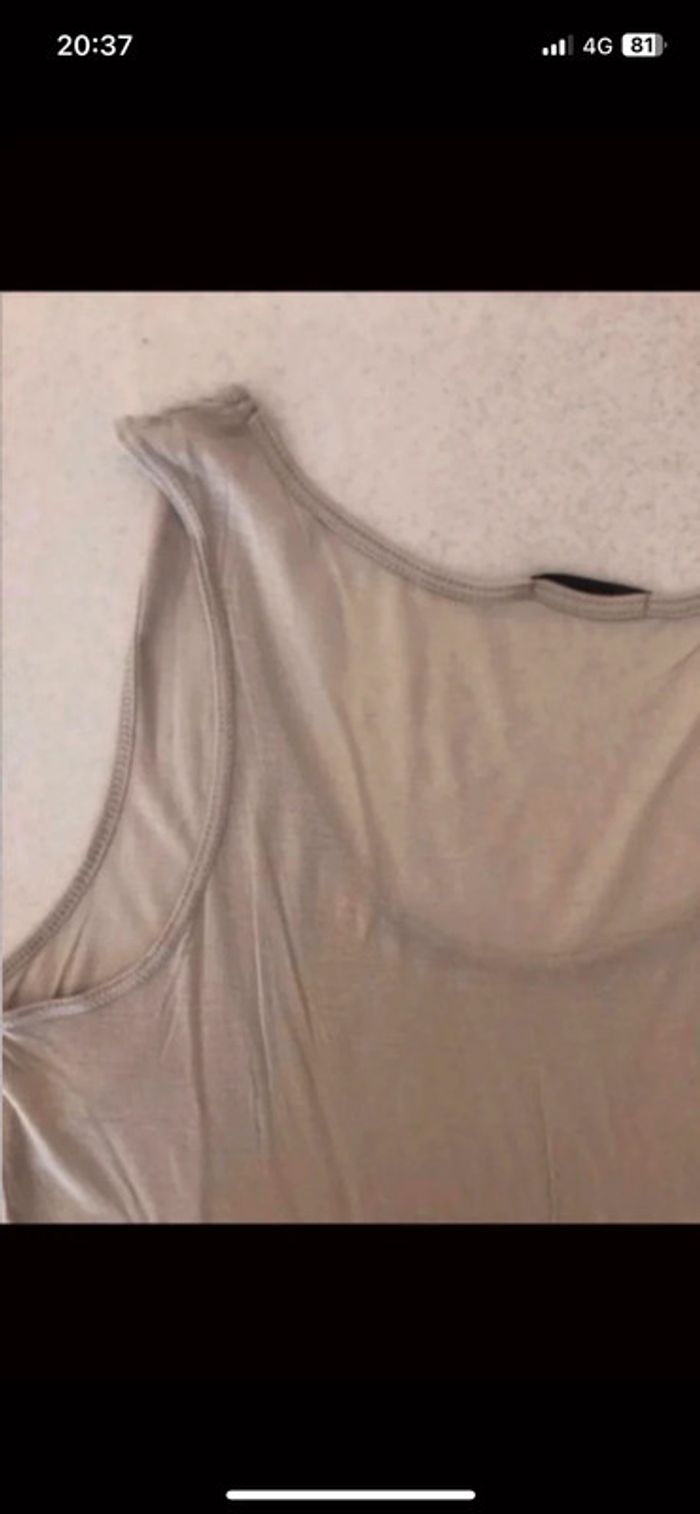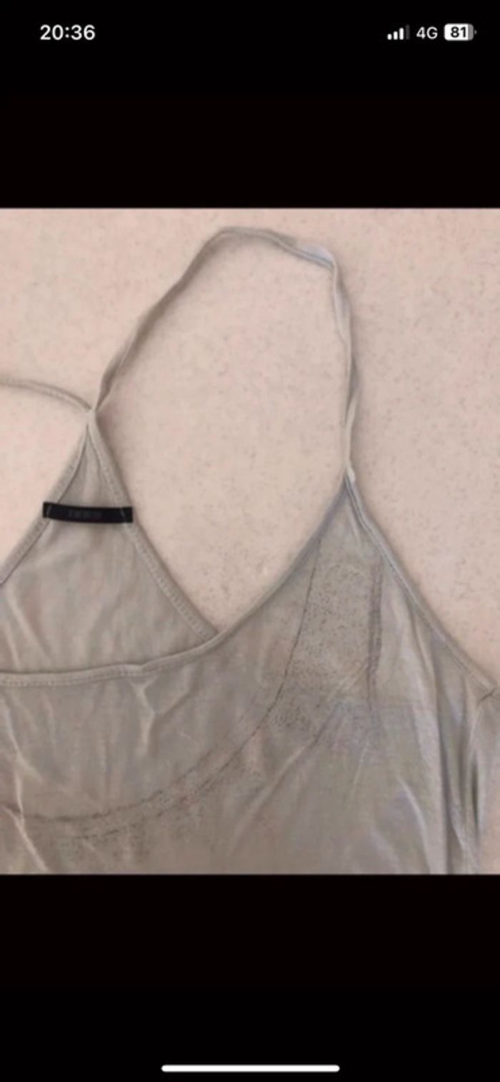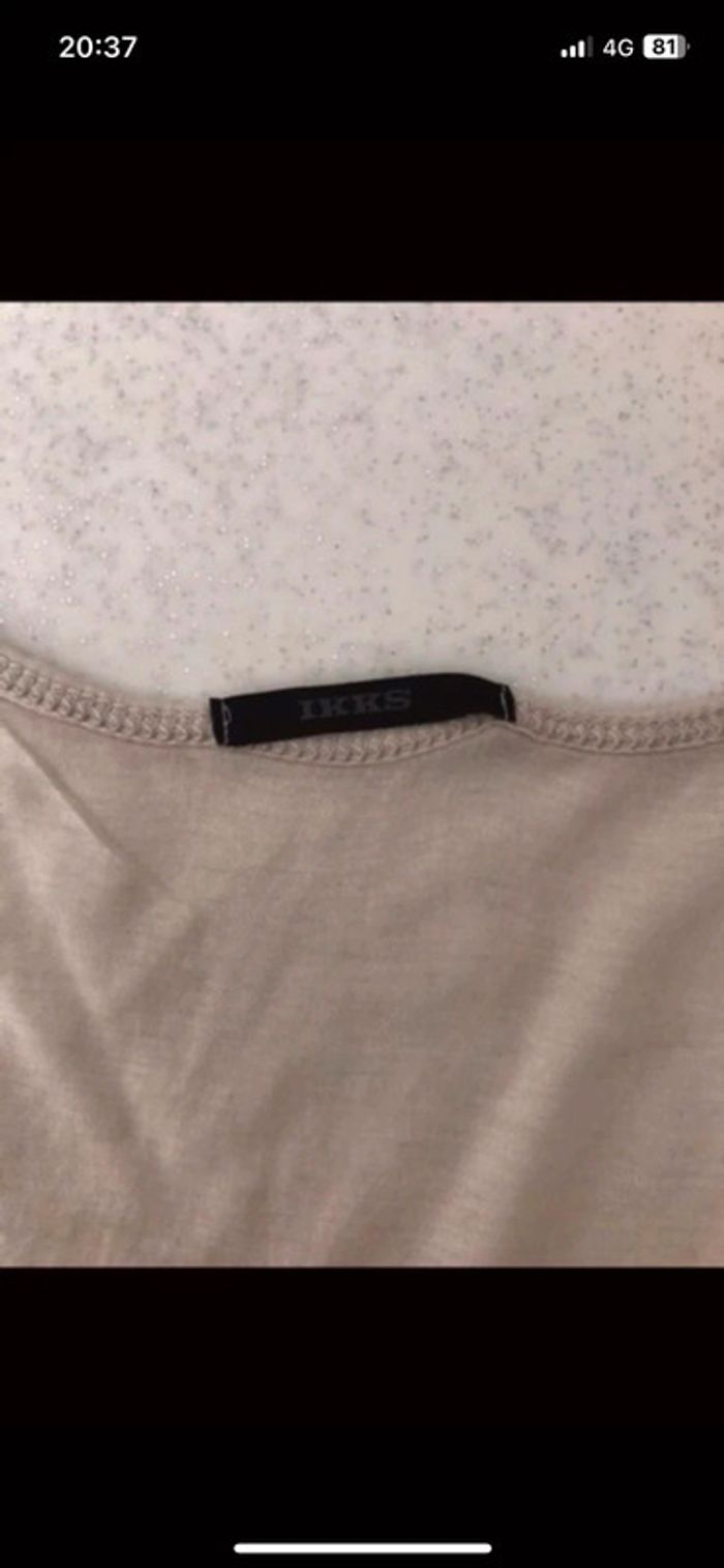 Débardeur femme IKKS en bon état. Il est composé de deux parties : - un premier sous débardeur beige qui présente un petit trou à l’arrière. - un débardeur plus court couleur gris -kaki avec motif qui se met par-dessus le premier. Il présente de petits accros. Les défauts sont visibles sur les photos. #hautsfemme38leanelyne
