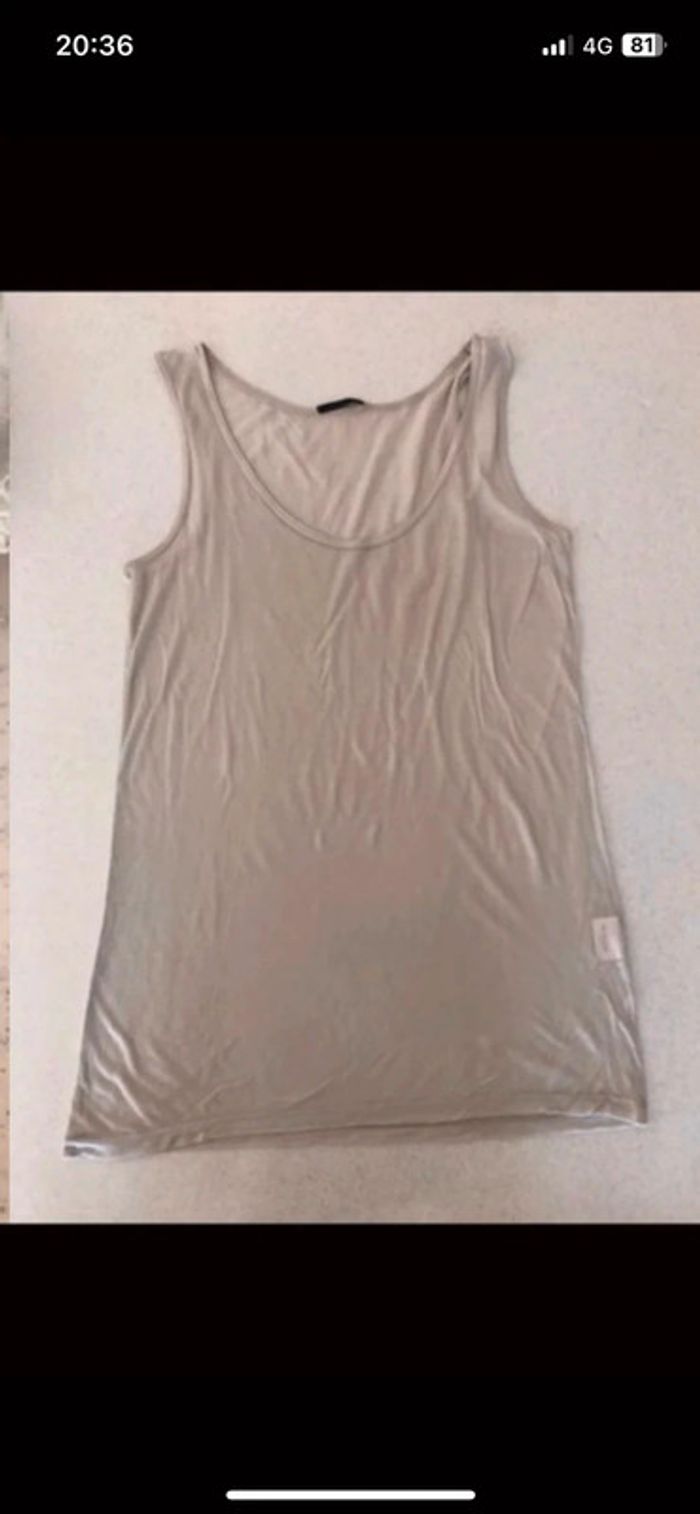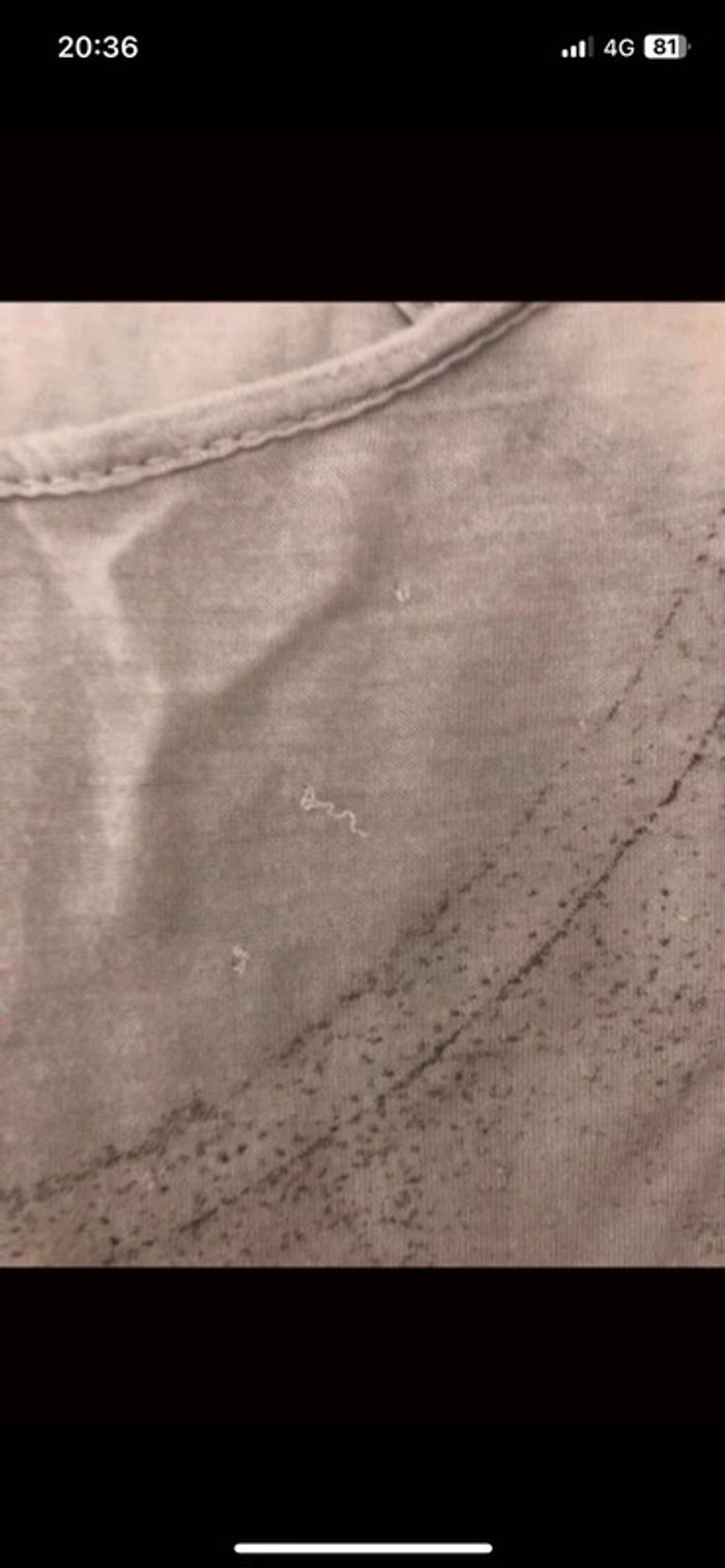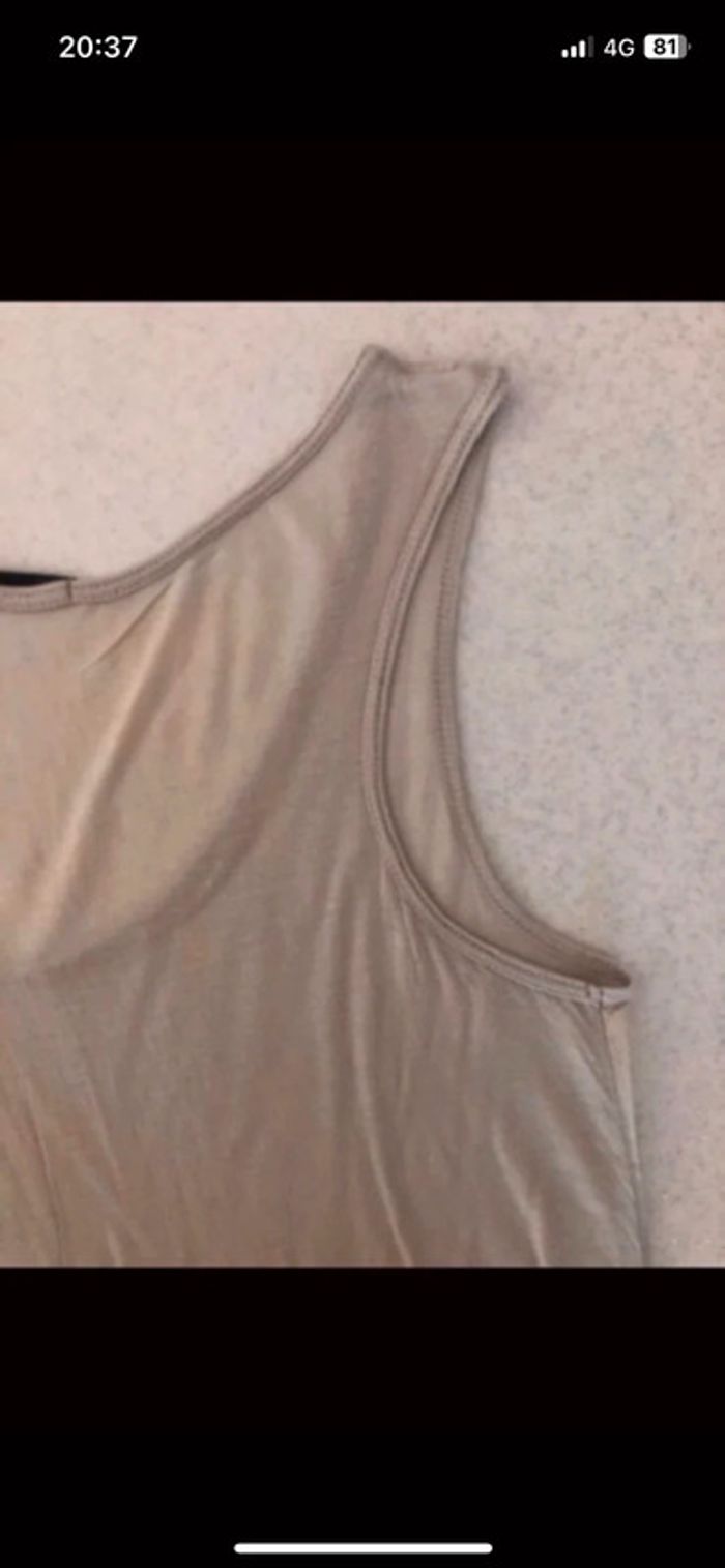 Débardeur femme IKKS en bon état. Il est composé de deux parties : - un premier sous débardeur beige qui présente un petit trou à l’arrière. - un débardeur plus court couleur gris -kaki avec motif qui se met par-dessus le premier. Il présente de petits accros. Les défauts sont visibles sur les photos. #hautsfemme38leanelyne