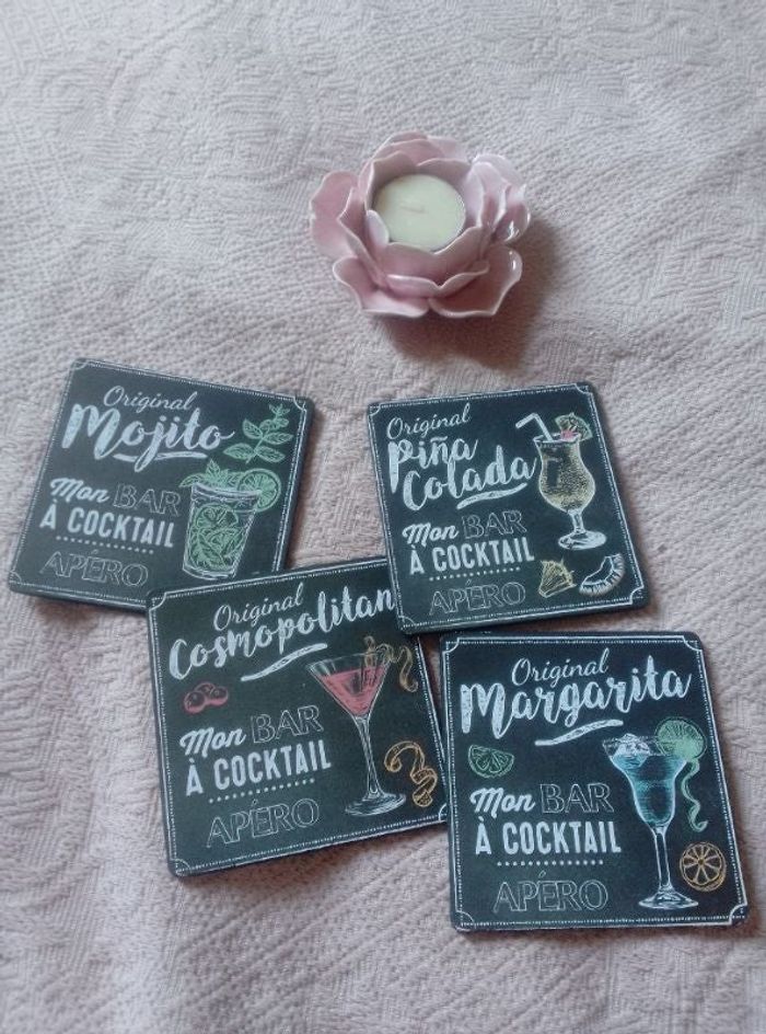 Lots 4 sous verre Noir et motif apéro Matière liege Très bon état Prix 1.50€ Les Réductions sont activés sur les lots