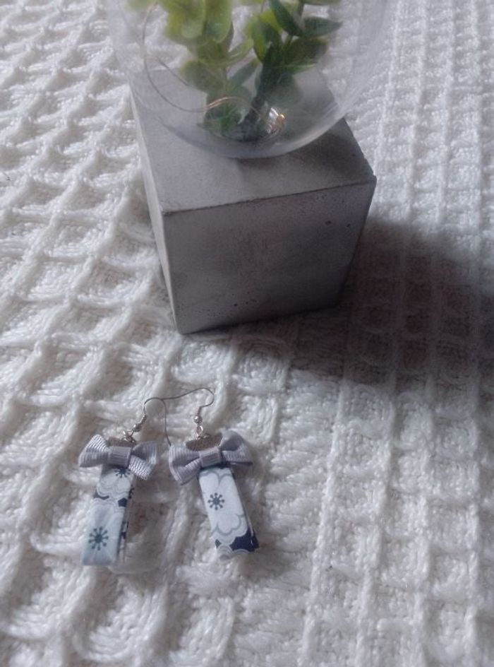 Boucles d'oreilles Tissu Blanc et gris Très bon état Fait main Prix 1.80€ Les réductions sont activés sur les lots a partir du 2 ème articles