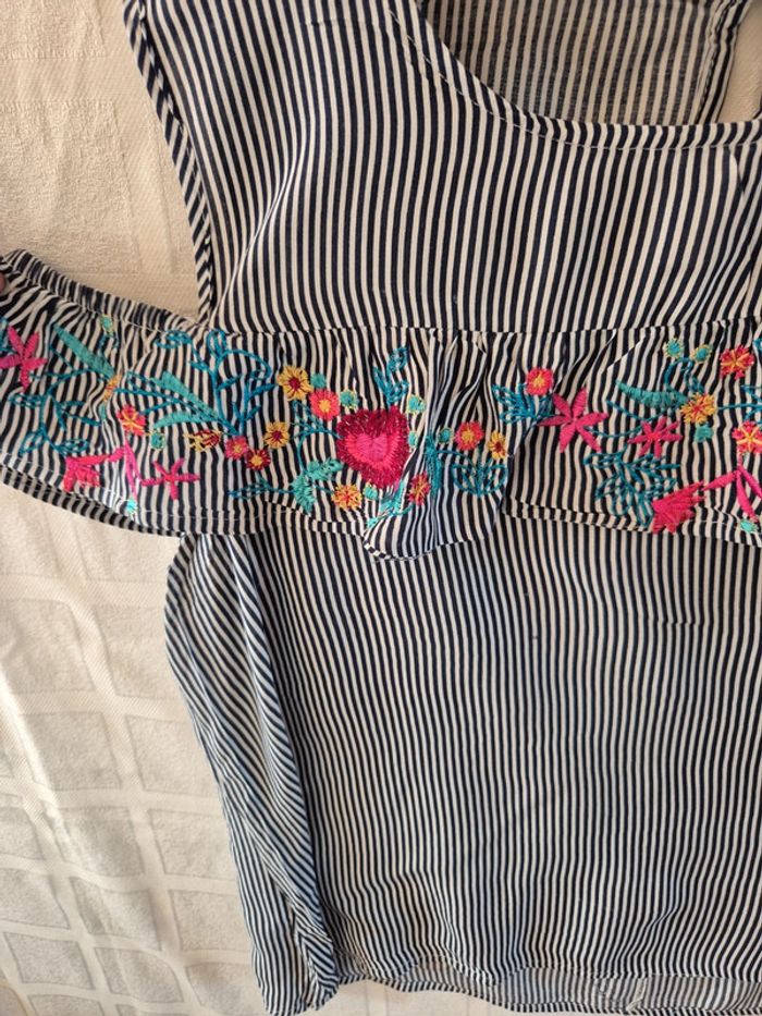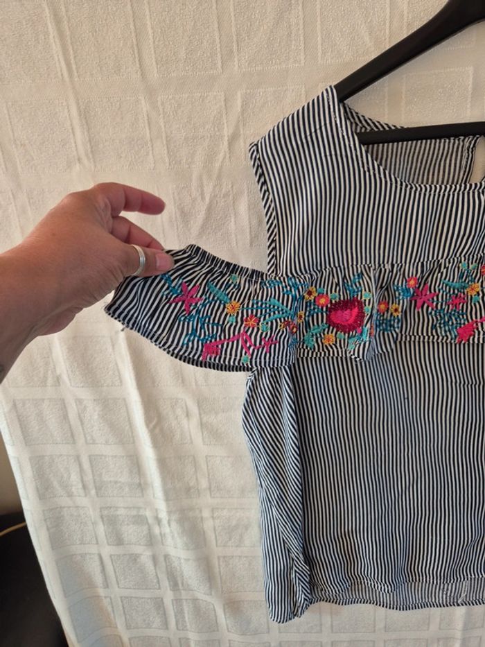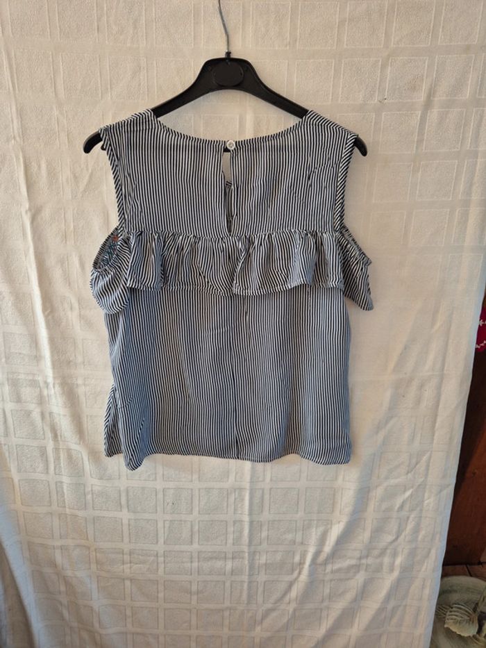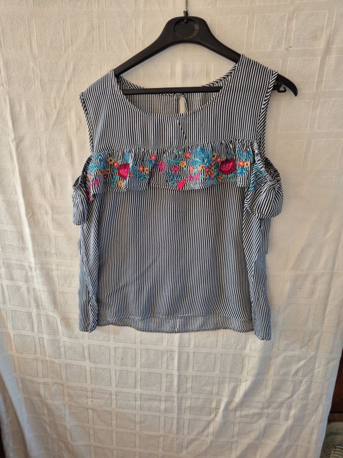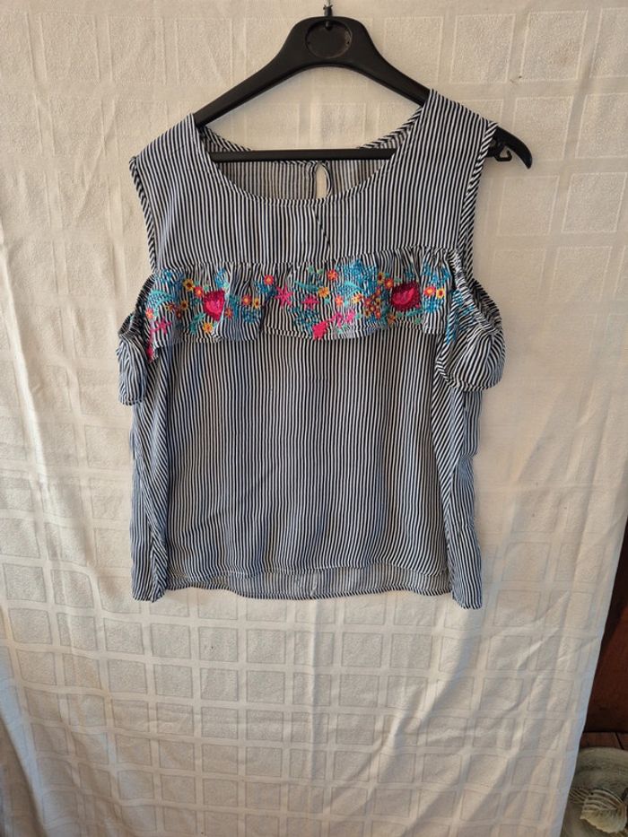 ⬇️mes autres annonces pour femme en taille 38 👉 #cg89femme38 un top ou blouse avec épaules dénudées et broderies devant sur le volant . Il mesure 52 cm aux aisselles et 57 cm de longueur. très bon état - taille 38 #top #blouse #tshirt #haut