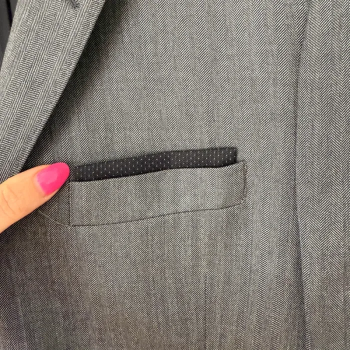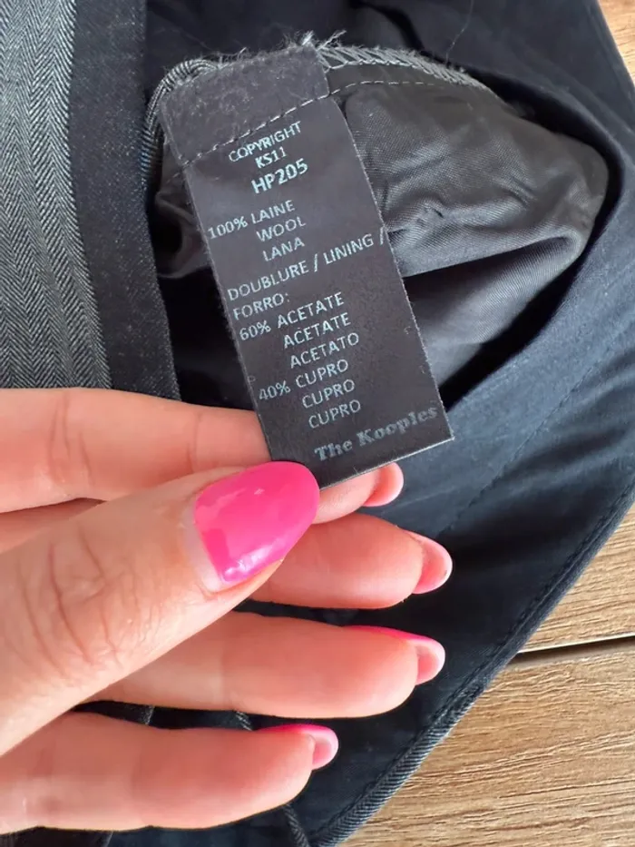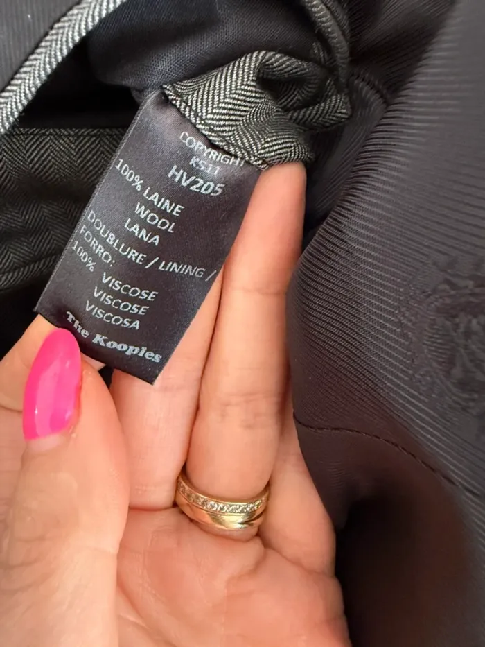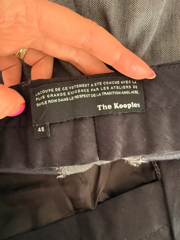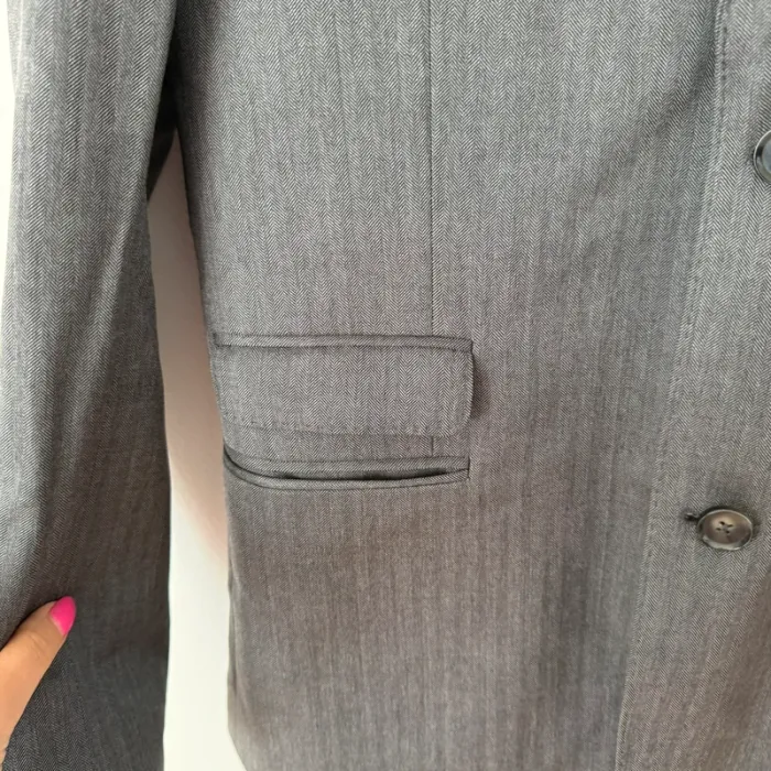Costume élégant The Kooples en laine grise à chevrons, coupe moderne et finitions soignées, parfait pour une allure chic au bureau ou en cérémonie. Veste doublée et pantalon assorti, confection haut de gamme inspirée de la tradition Savile Row. #thekooples #costumehomme #taille48 #laine #gris #élégant #chic #workwear #cérémonie