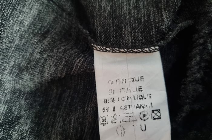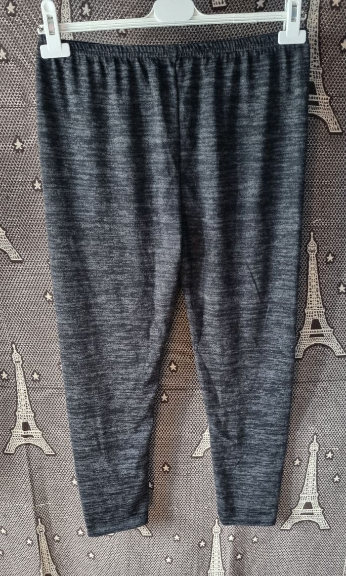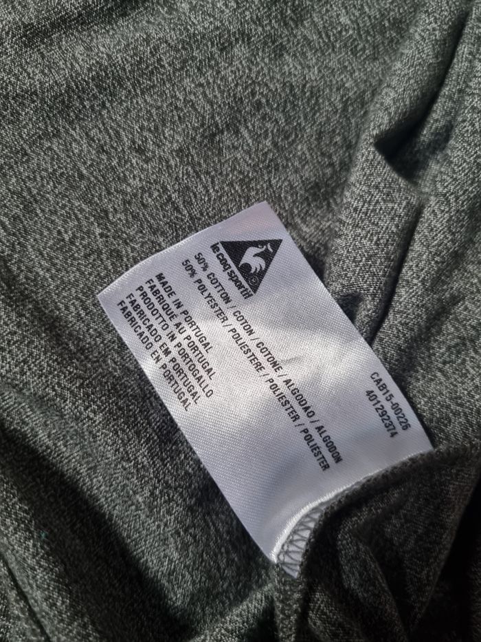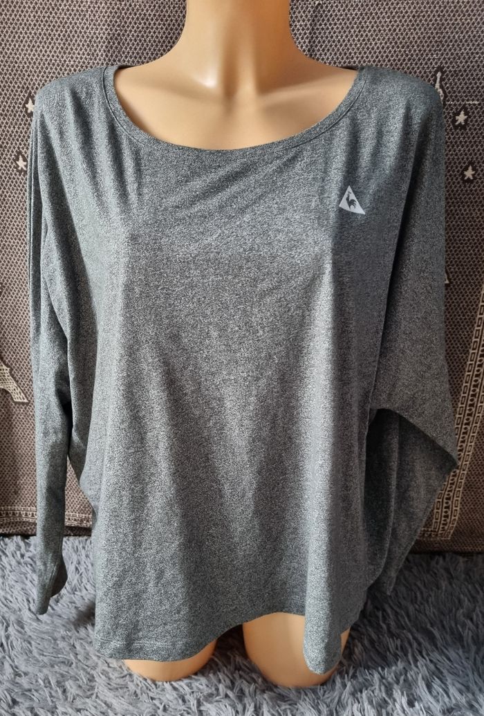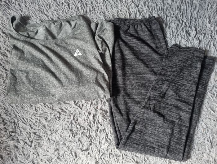 Ensemble de sport gris taille XL: -T-shirt à manches longues gris marque Le Coq Sportif, longueur 61cm, largeur 66cm, longueur épaule à aisselle 30cm, largeur aisselle à aisselle 82cm, longueur manche 38cm, largeur épaule à épaule 58cm, -pantalon legging gris foncé chiné (pas de marque), longueur 91cm, largeur de la taille 35cm jusqu'à 49cm,largeur cuisse 30cm, largeur cheville 14cm.