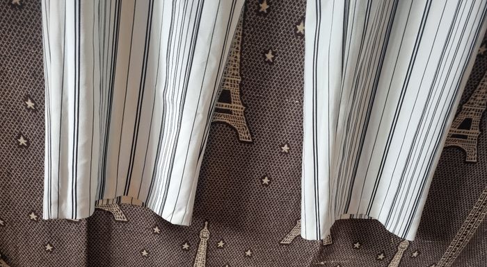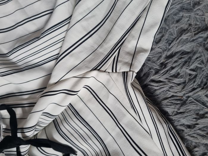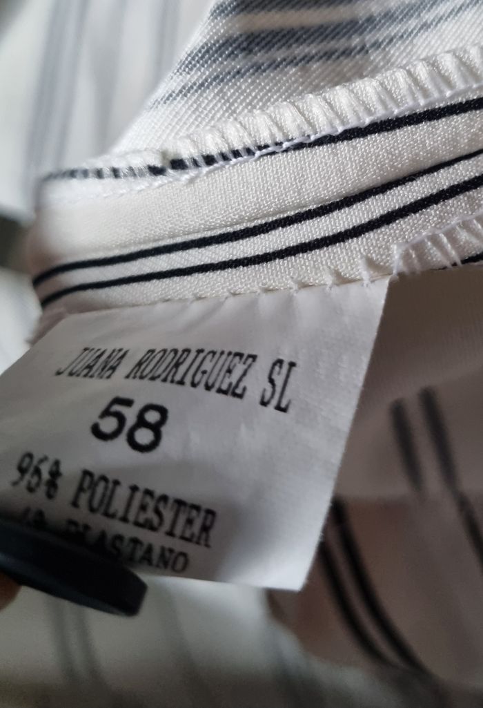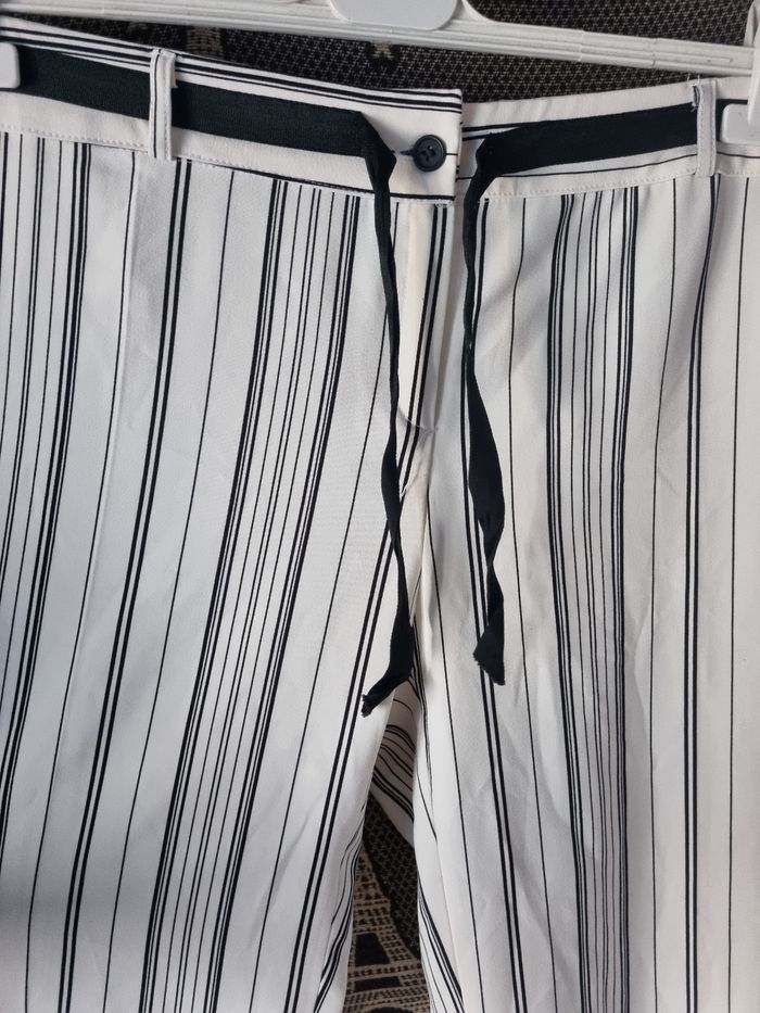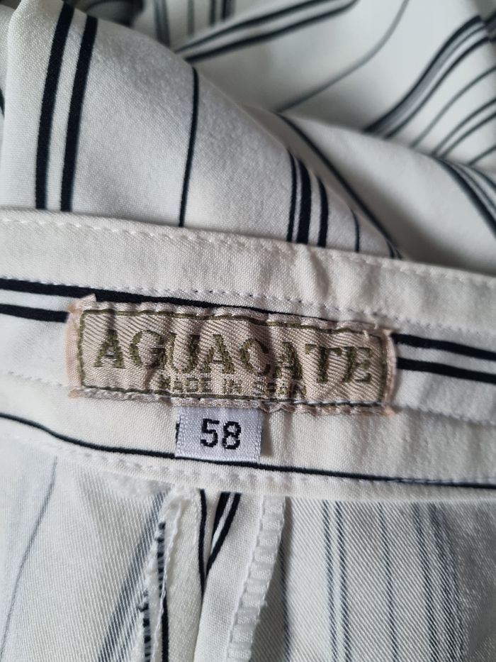 Pantalon blanc cassé à rayures noir,taille 58 marque Aguacate,fermeture zippée avec bouton, longueur 110cm, largeur de la taille 59cm, largeur cuisse 37cm, largeur cheville 29cm,ourlets on été fait.