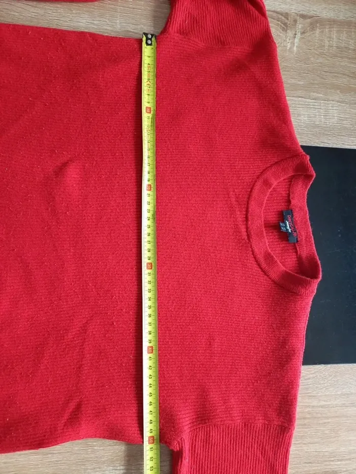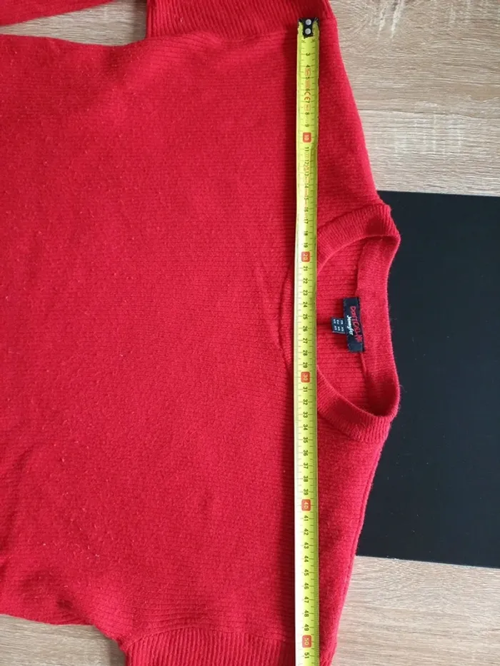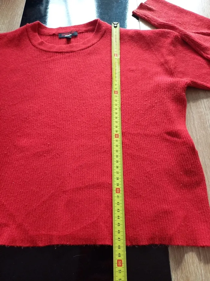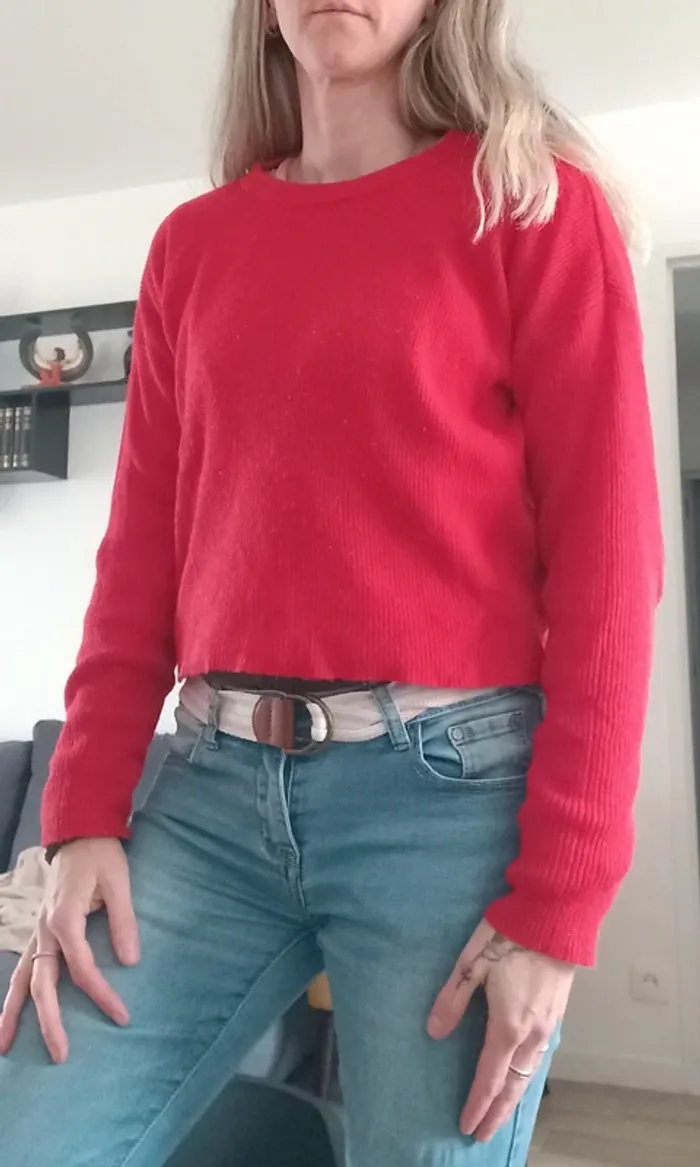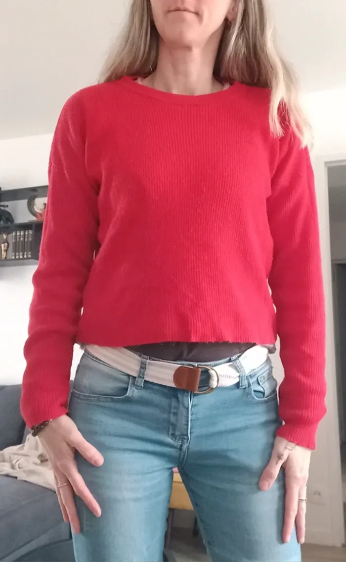 Petit pull rouge assez court. Marqué XS mais convient plutôt à taille M ! Dimensions sur photos Je fais 51 kg il me vat