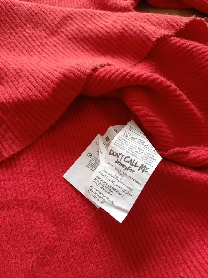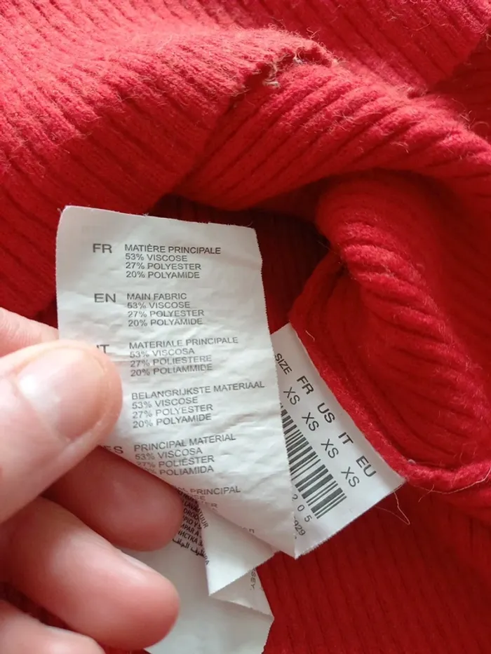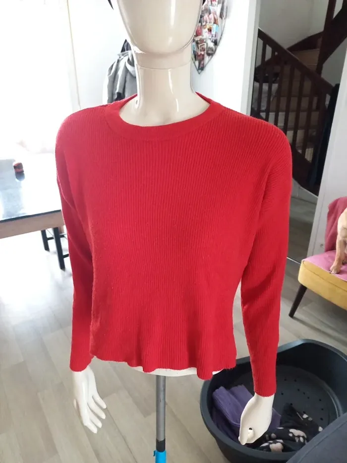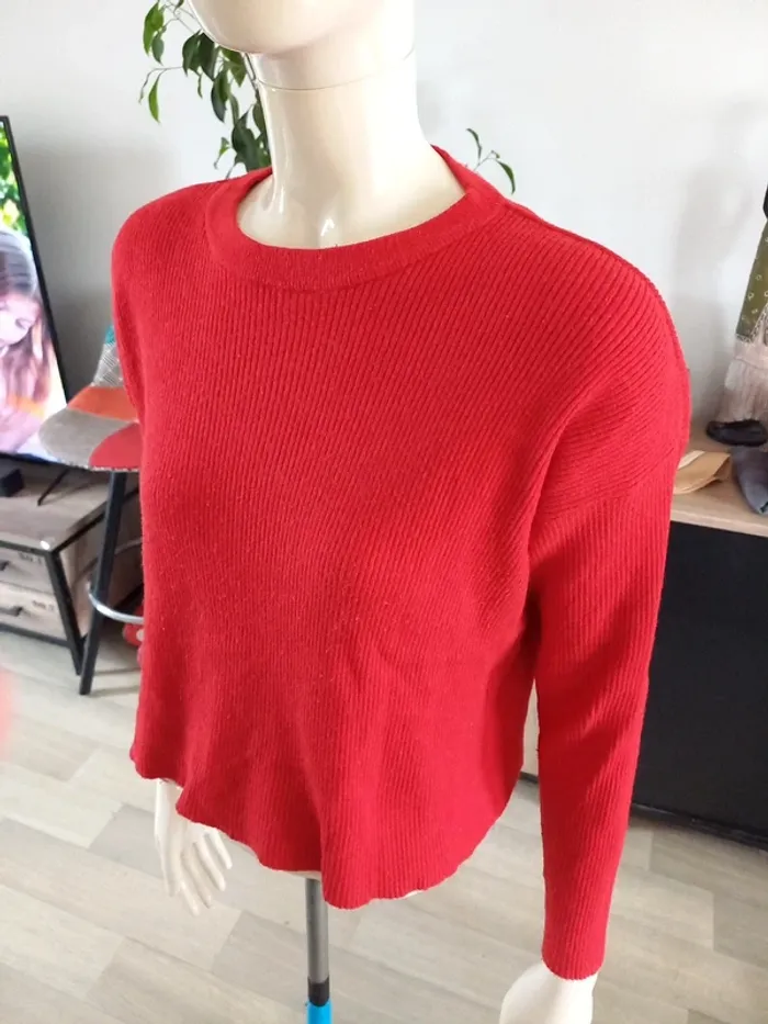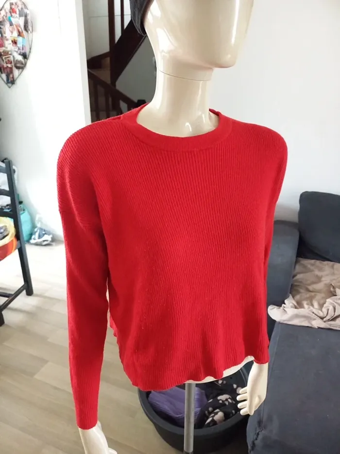 Petit pull rouge assez court. Marqué XS mais convient plutôt à taille M ! Dimensions sur photos Je fais 51 kg il me vat