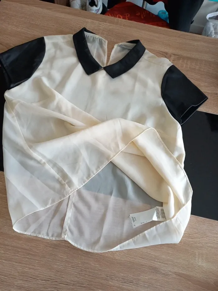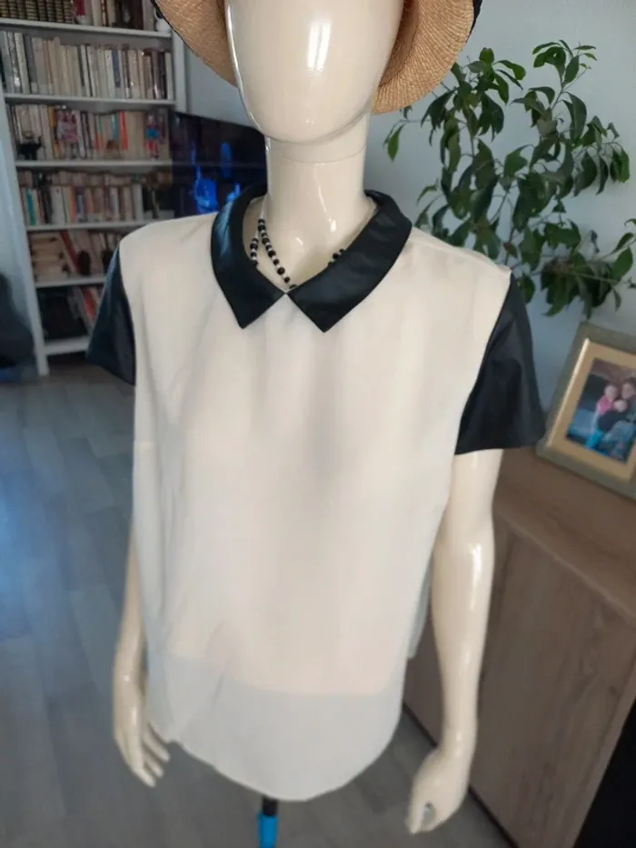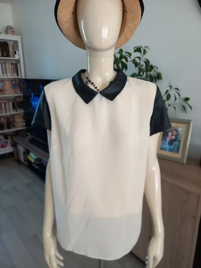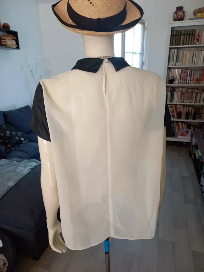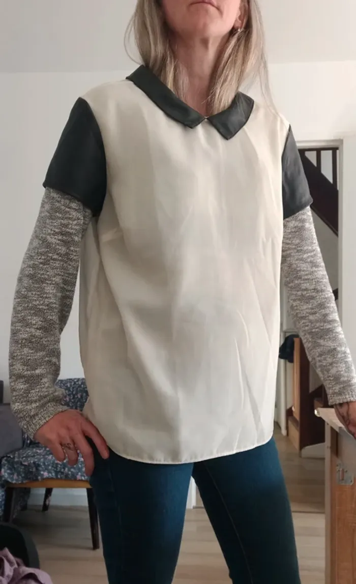 Tee-shirt femme bi-matière. En transparence crème et similicuir noir. Noté T44 mais convient mieux pour taille 40/42 je pense (Dernieres photos éssayé par dessus mon pull, je fais T.38)