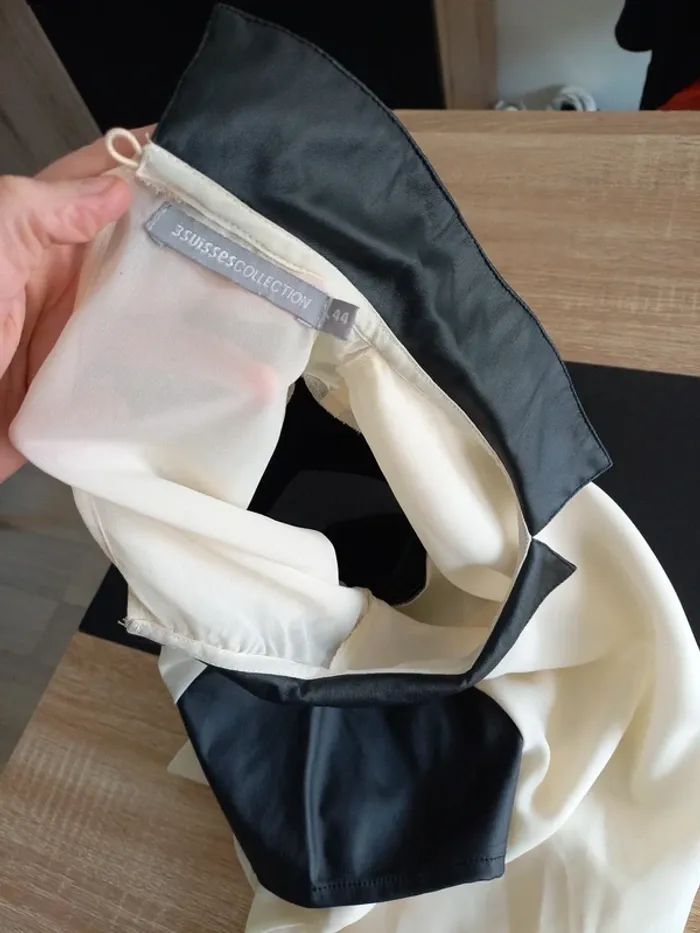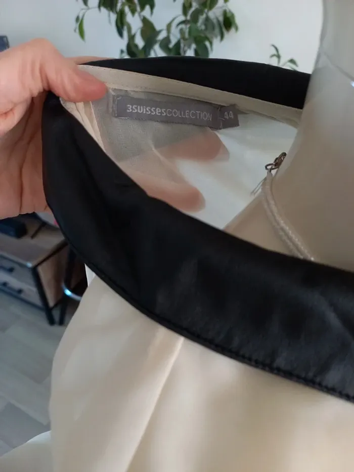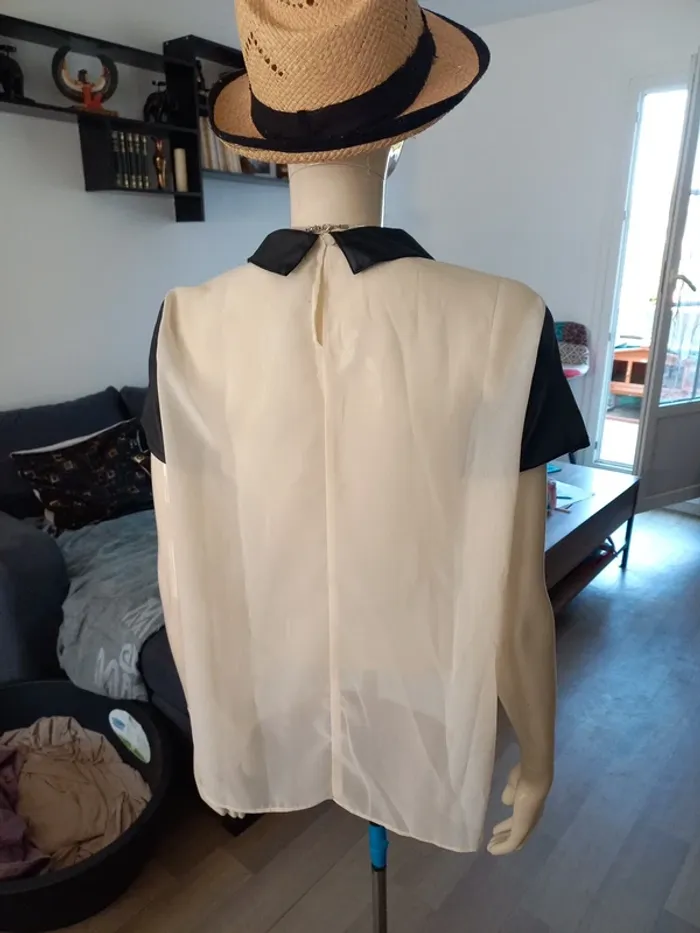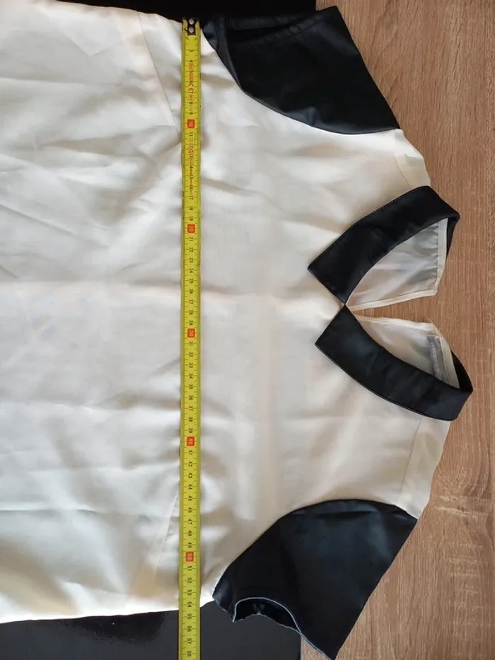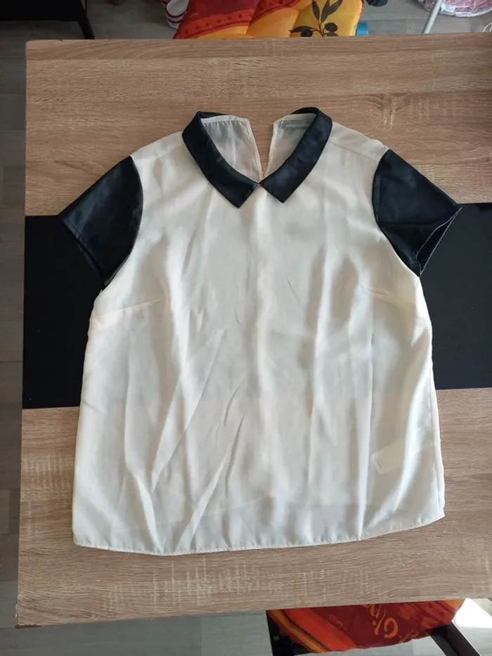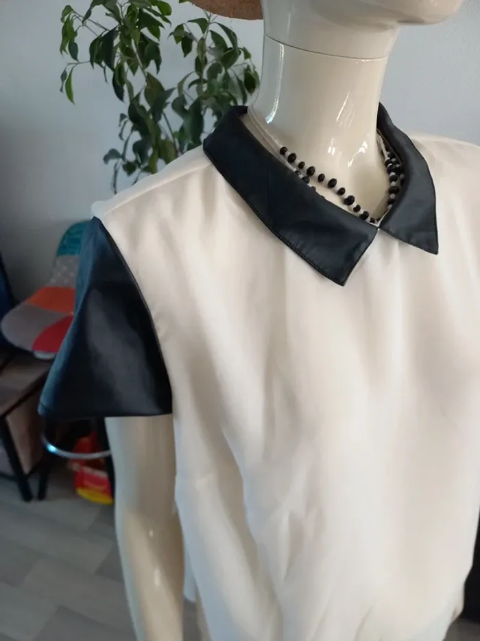 Tee-shirt femme bi-matière. En transparence crème et similicuir noir. Noté T44 mais convient mieux pour taille 40/42 je pense (Dernieres photos éssayé par dessus mon pull, je fais T.38)