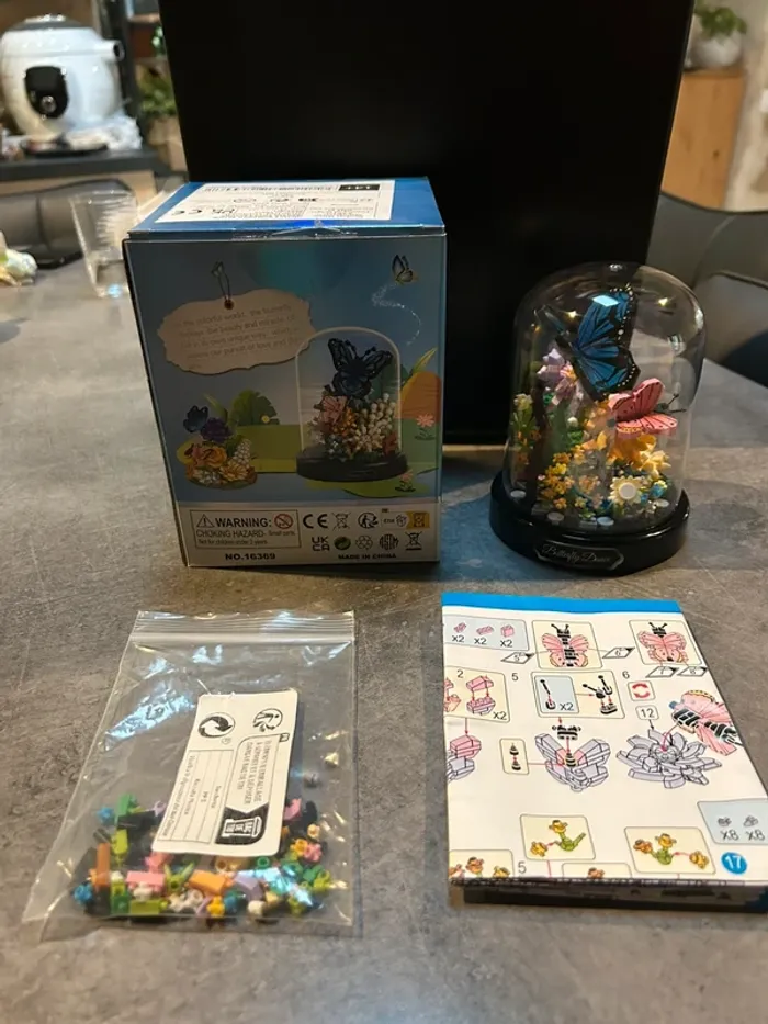 Mini bloc de construction papillons et fleurs sous cloche. Monté une seul fois puis défait pour la vente. Seul les paillons ne sont pas défait car il y a des autocollants sur les ailes. Vendu avec boîte d’origine et notice de montage.
