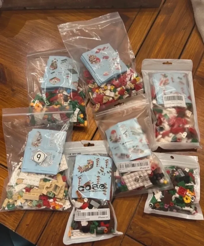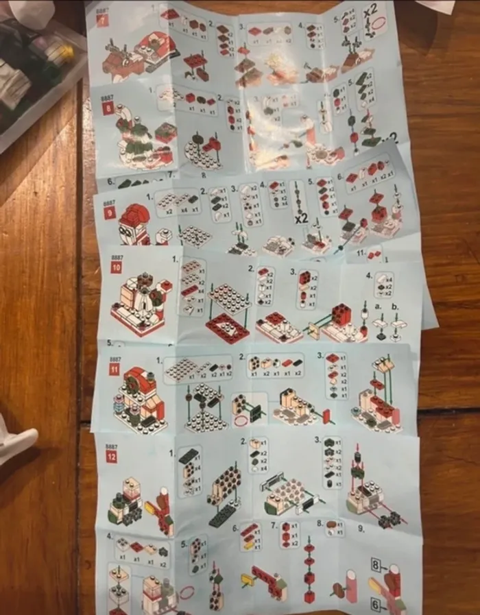 Lot de bloc de construction noël Vous pouvez faire 6 grosses constructions ou alors possibilité de faire 6 petites construction avec 1 grosse construction. Donc soit 6 grosses constructions ou alors 36 petites constructions. Monter une seul fois. 1 sachet de pièces supplémentaires. 1 pièce de cassée voir photo, elle peut être remplacé par une autre d'une autre couleur, je la laisse dans le sachet si vous souhaiter la recoller éventuellement.